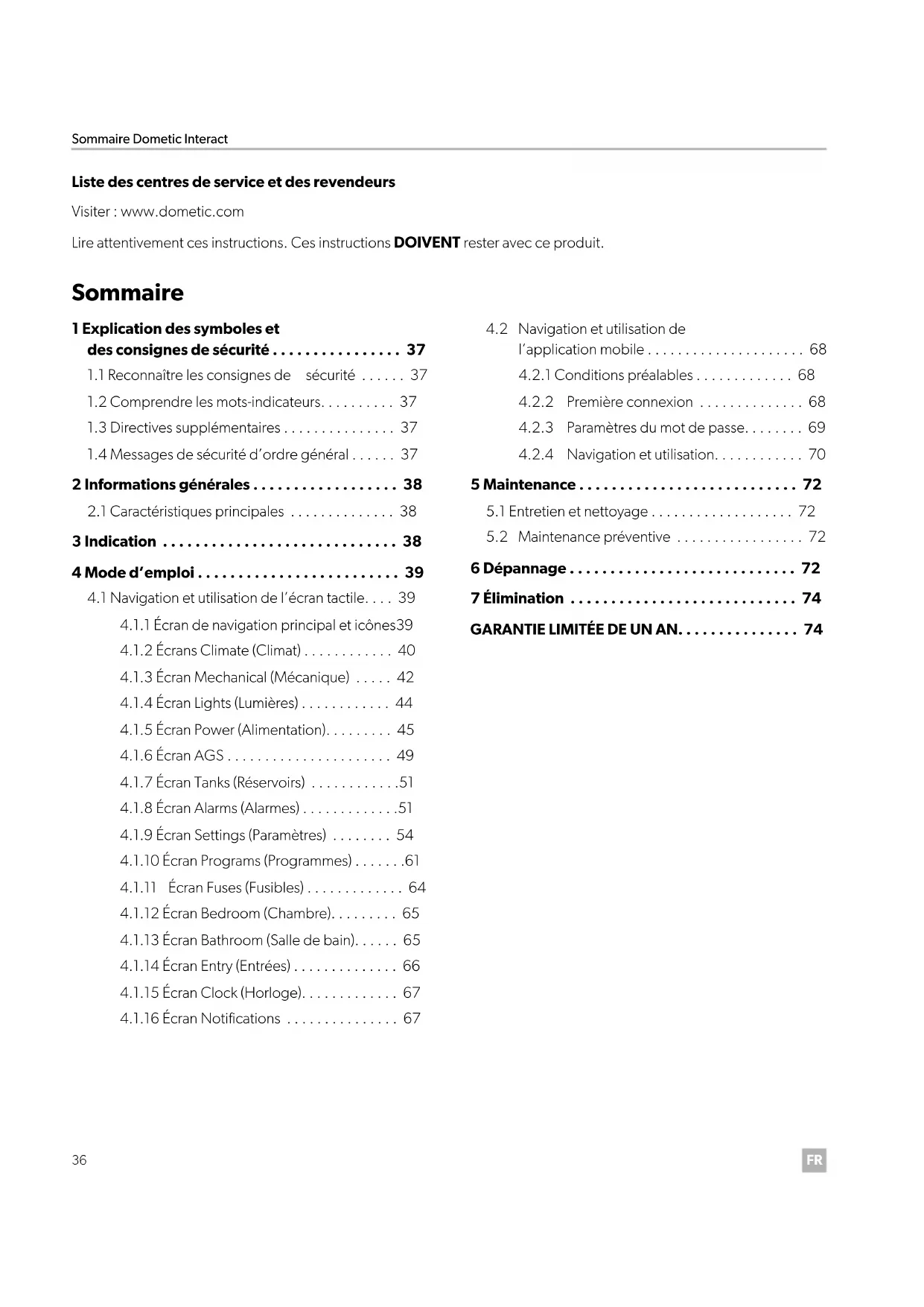 Liste des centres de service et des revendeurs Visiter : www.dometic.com Lire attentivement ces instructions. Ces instructions DOIVENT rester avec ce produit. Sommaire 1 Explication des symboles et des consignes de sécurité ... 37