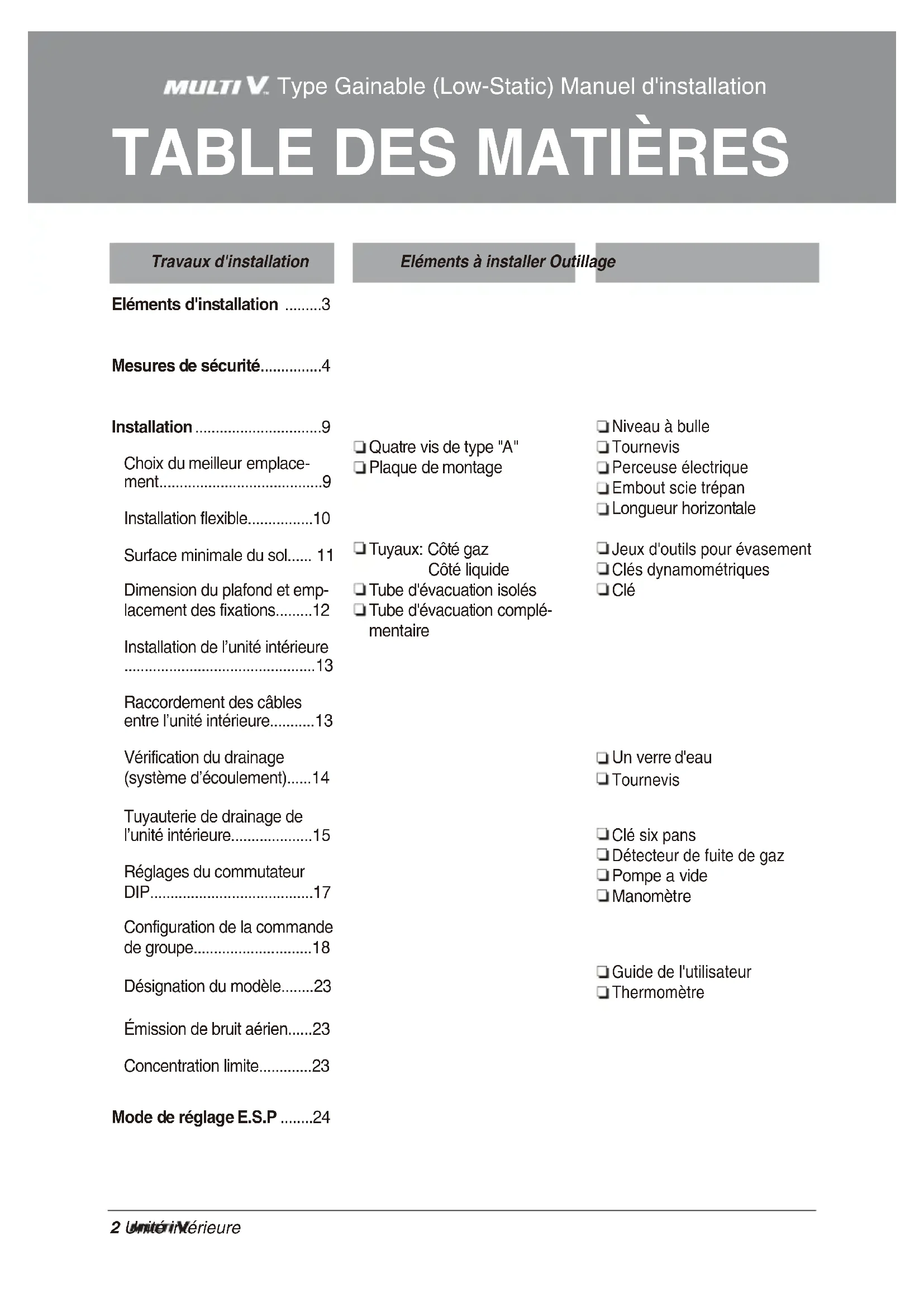 - Utilisez un conduit non combustible complètement fermé si les normes de construction locales exigent un câble pour vide technique. ATTENTION2324 Unité intérieure Mode de réglage E.S.P Mode de réglage E.S.P (Unité : CMM) Setting Value Static Pressure(mmAq(Pa)) (Unité : CMM) Setting Value Static Pressure(mmAq(Pa)) (Unité : CMM) Setting Value Static Pressure(mmAq(Pa)) Remarque :