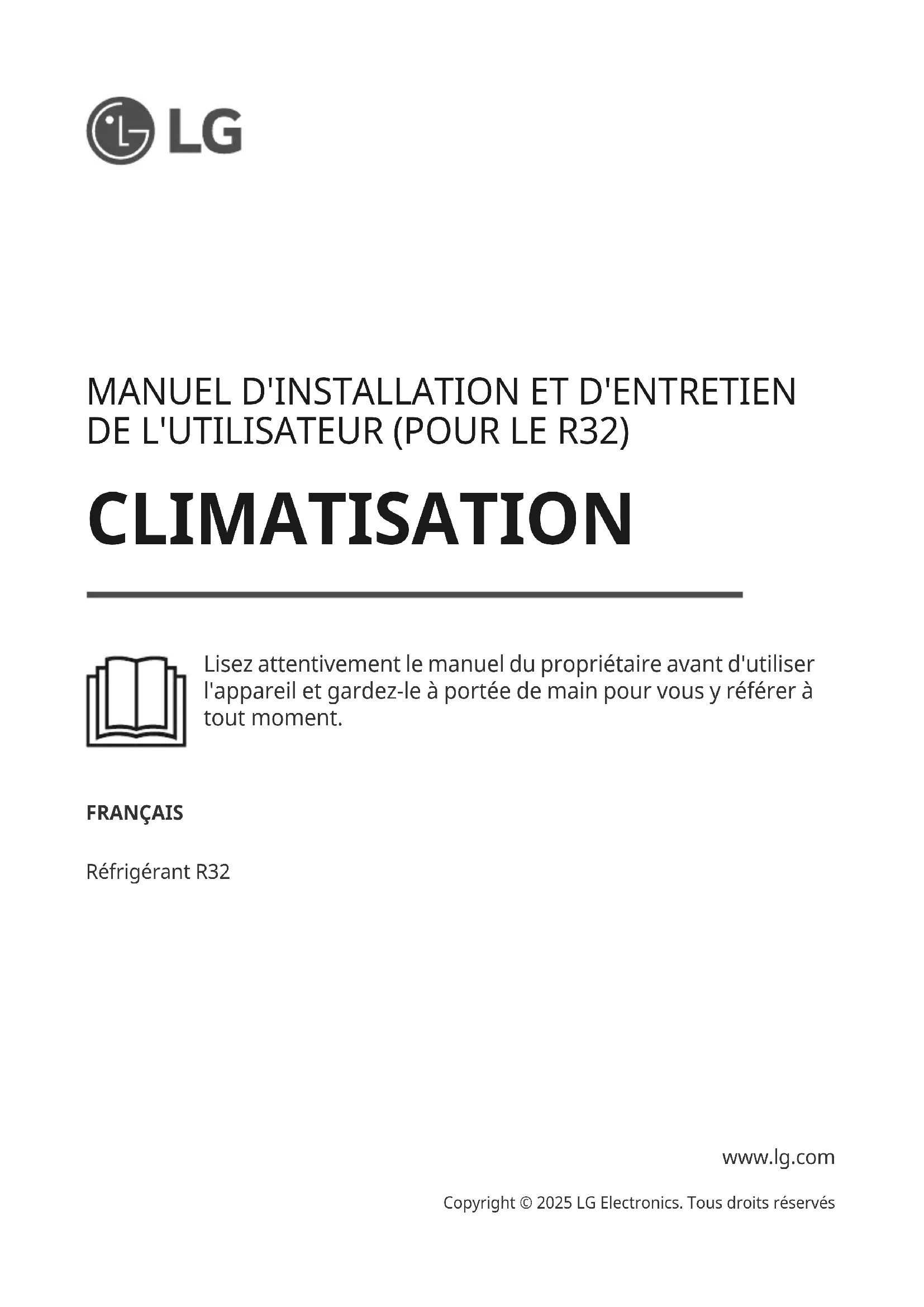 Es la carga real de refrigerante del refrigerante en el sistema en kg; Es la carga máxima admisible de refrigerante en el sistema en kg, Calculada de acuerdo con la siguiente ecuación o 15 964 kg.MANUEL D'INSTALLATION ET D'ENTRETIEN DE L'UTILISATEUR (POUR LE R32) CLIMATISATION Lisez attentivement le manuel du propriétaire avant d'utiliser l'appareil et gardez-le à portée de main pour vous y référer à tout moment. FRANÇAIS Réfrigérant R32 www.lg.com Copyright © 2025 LG Electronics. Tous droits réservésTABLE DES MATIÈRES Ce manuel peut contenir des images ou un contenu différent du modèle que vous avez acheté. Ce manuel est sujet à révision par le fabricant.