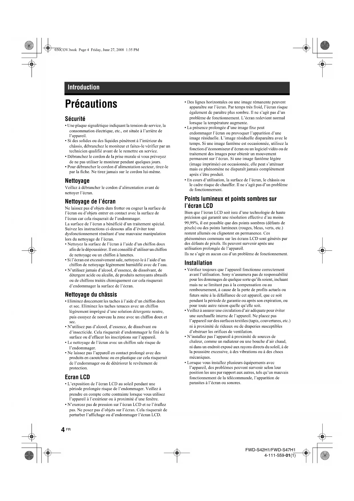Remballage Conservez le carton ainsi que les matériaux d’emballage. Vous pourriez en avoir de nouveau besoin pour transporter l’appareil ultérieurement. Lors du transport de l’appareil, remballez-le comme illustré sur le carton. Pour toute question au sujet de cet appareil, consultez un distributeur Sony agréé. Elimination des appareils électriques et électroniques professionnels en fin de vie (Applicable dans les pays de l’Union Européenne et aux autres pays européens disposant de systèmes de collecte sélective) Ce symbole, apposé sur le produit ou sur son emballage, indique que ce produit ne doit pas être traité avec les déchets ménagers. Il doit être déposé dans un point de collecte spécialisé dans le recyclage des équipements électriques et électroniques. En s’assurant que ce produit est bien mis au rebut de manière appropriée, vous aiderez à prévenir les conséquences négatives potentielles pour l’environnement et la santé humaine. Le recyclage des matériaux aidera à conserver les ressources naturelles. Pour toute information supplémentaire concernant le recyclage de ce produit, contactez votre centre Sony local ou consultez le site web de Sony pour l’Europe destiné aux professionnels : http://www.sonybiz.net/environment 030COV.book Page 5 Friday, June 27, 2008 1:35 PMFWD-S42H1/FWD-S47H14-111-559-01(1)