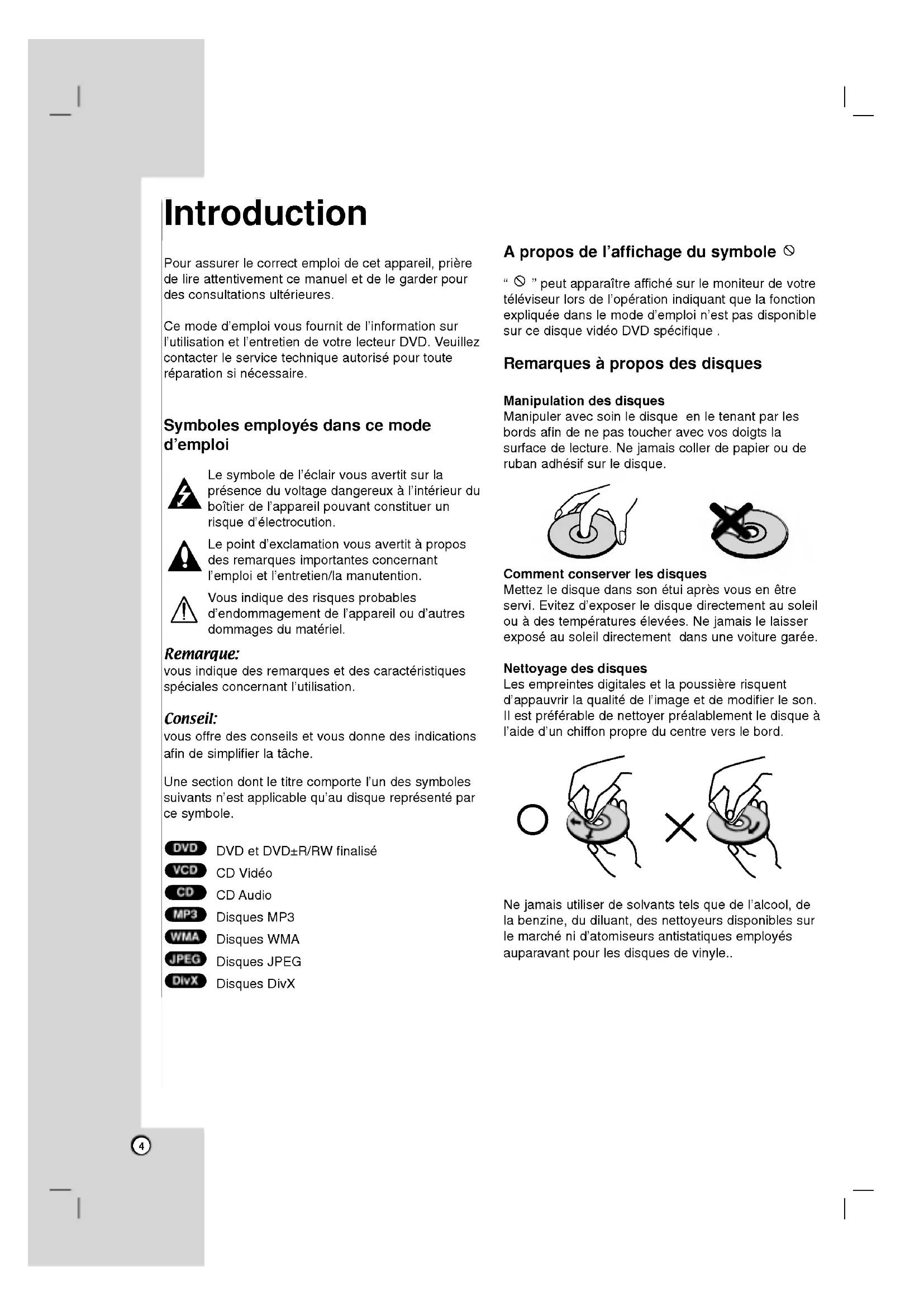 propos des disques Manipulation des disques Manipuler avecsoinle disque enletenantparlesbordsafindenepastoucheravecvos doigts lasurfacedelecture.Ne jamais collerde papier ouderubanadhesifsurle disque. Comment conserver les disques Mettezle disque danssonetui apres vousenetreservi.Evitez d'exposer disque directementausoleilouades temperatures elevees.Ne jamais lelaisser expose ausoleildirectementdansunevoiture garee. Nettoyage des disques Les empreintes digitales etla poussiere risquent d'appauvrir qualite l'image etdemodifierleson.Ilest preferable nettoyer prealablement disque al'aided'unchiffonpropreducentreverslebord.Ne jamais utiliserdesolvantstelsquede l'alcool, dela benzine, diluant, des nettoyeurs disponibles surlemarchenid'atomiseurs antistatiques employes auparavant pourles disques vinyle.. DivXJPEGWMAMP3CDVCDDVD Introduction5 Types disques dontlalecture peut etre effectuee DVD (disquede8cm/12cm) CDVideo (VCD) (disque de8cm/12cm) CDAudio (disque de8cm/12cm) outre, cet appareil peut effectuerlalecturefichier DivX, DVD -R, DVD +R, DVD -RW, DVD +RW, SVCD, etCD-R/CD-RWcontenantdestitres audio, MP3, WMA, et/oudesfichiersJPEG. Remarques: ?Selonlesconditionsde l'appareil d'enregistrement