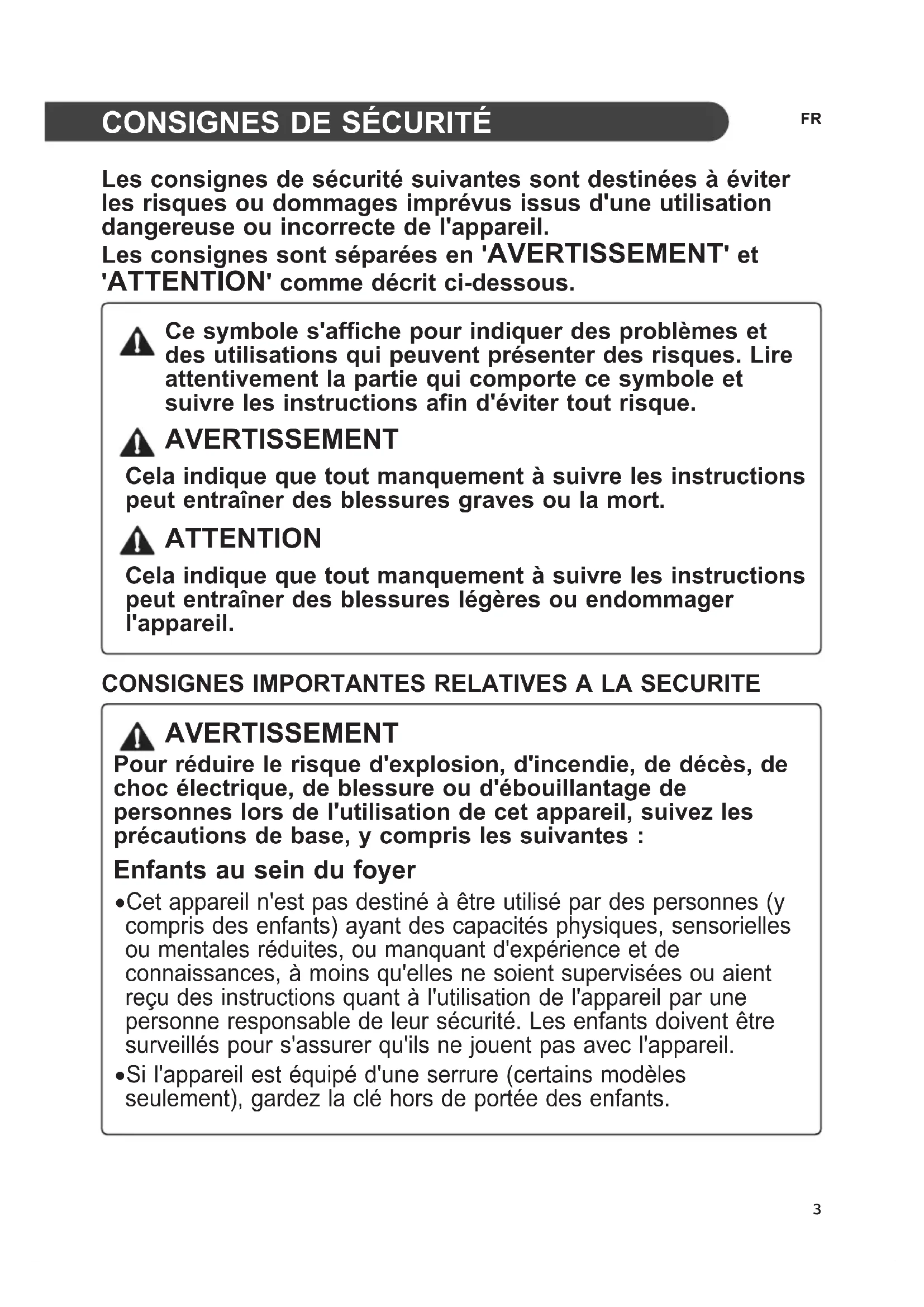 AVERTISSEMENT Pour réduire le risque d'explosion, d'incendie, de décès, de choc électrique, de blessure ou d'ébouillantage de personnes lors de l'utilisation de cet appareil, suivez les précautions de base, y compris les suivantes : Enfants au sein du foyer