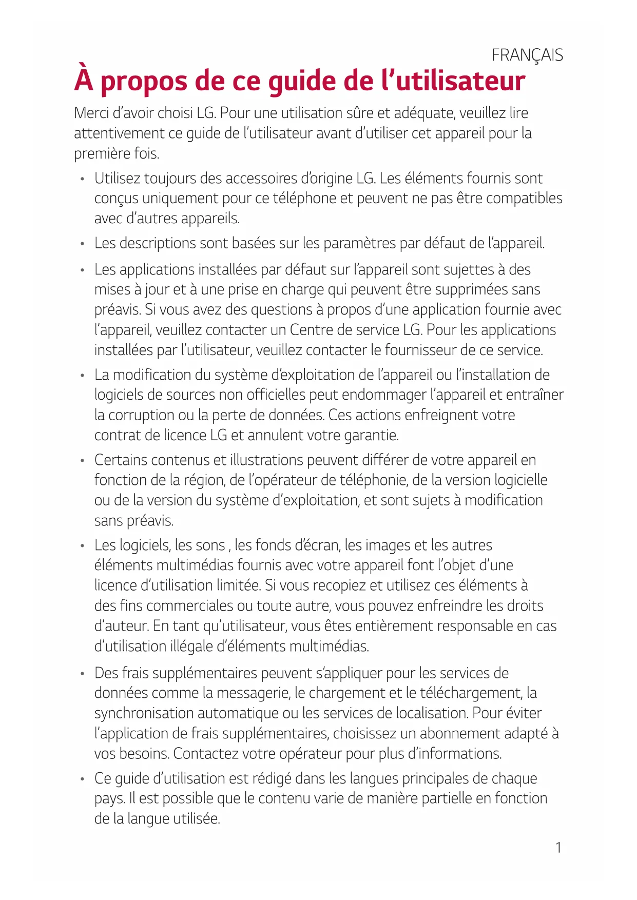 - La modification du système d’exploitation de l’appareil ou l’installation de logiciels de sources non officielles peut endommager l’appareil et entraîner la corruption ou la perte de données. Ces actions enfreignent votre contrat de licence LG et annulent votre garantie.