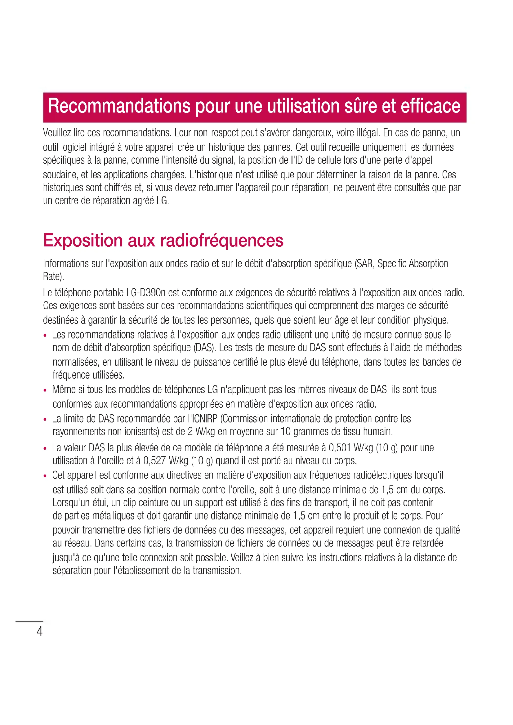 - Même si tous les modèles de téléphones LG n'appliquent pas les mêmes niveaux de DAS, ils sont tous conformes aux recommandations appropriées en matière d'exposition aux ondes radio.