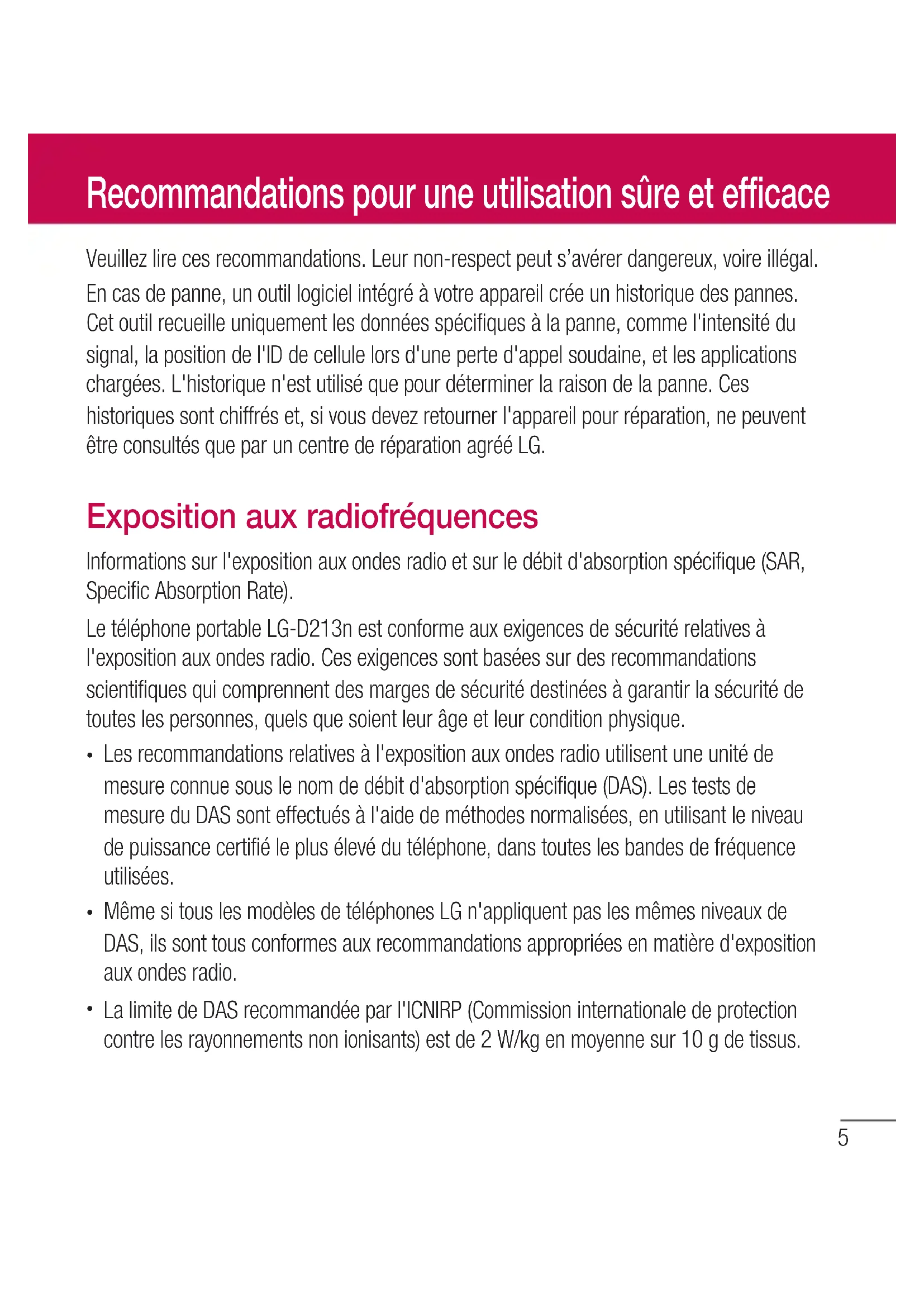 - FAQ Veuillezlirecesrecommandations.Leurnon-respectpeuts’avérerdangereux,voireillégal. Encasdepanne,unoutillogicielintégréàvotreappareilcréeunhistoriquedespannes. Cetoutilrecueilleuniquementlesdonnéesspécifiquesàlapanne,commel'intensitédu signal,lapositiondel'IDdecellulelorsd'uneperted'appelsoudaine,etlesapplications chargées.L'historiquen'estutiliséquepourdéterminerlaraisondelapanne.Ces historiquessontchiffréset,sivousdevezretournerl'appareilpourréparation,nepeuvent êtreconsultésqueparuncentrederéparationagrééLG. Exposition aux radiofréquences Informationssurl'expositionauxondesradioetsurledébitd'absorptionspécifique(SAR, SpecificAbsorptionRate). LetéléphoneportableLG-D213nestconformeauxexigencesdesécuritérelativesà l'expositionauxondesradio.Cesexigencessontbaséessurdesrecommandations scientifiquesquicomprennentdesmargesdesécuritédestinéesàgarantirlasécuritéde touteslespersonnes,quelsquesoientleurâgeetleurconditionphysique. p. 1065