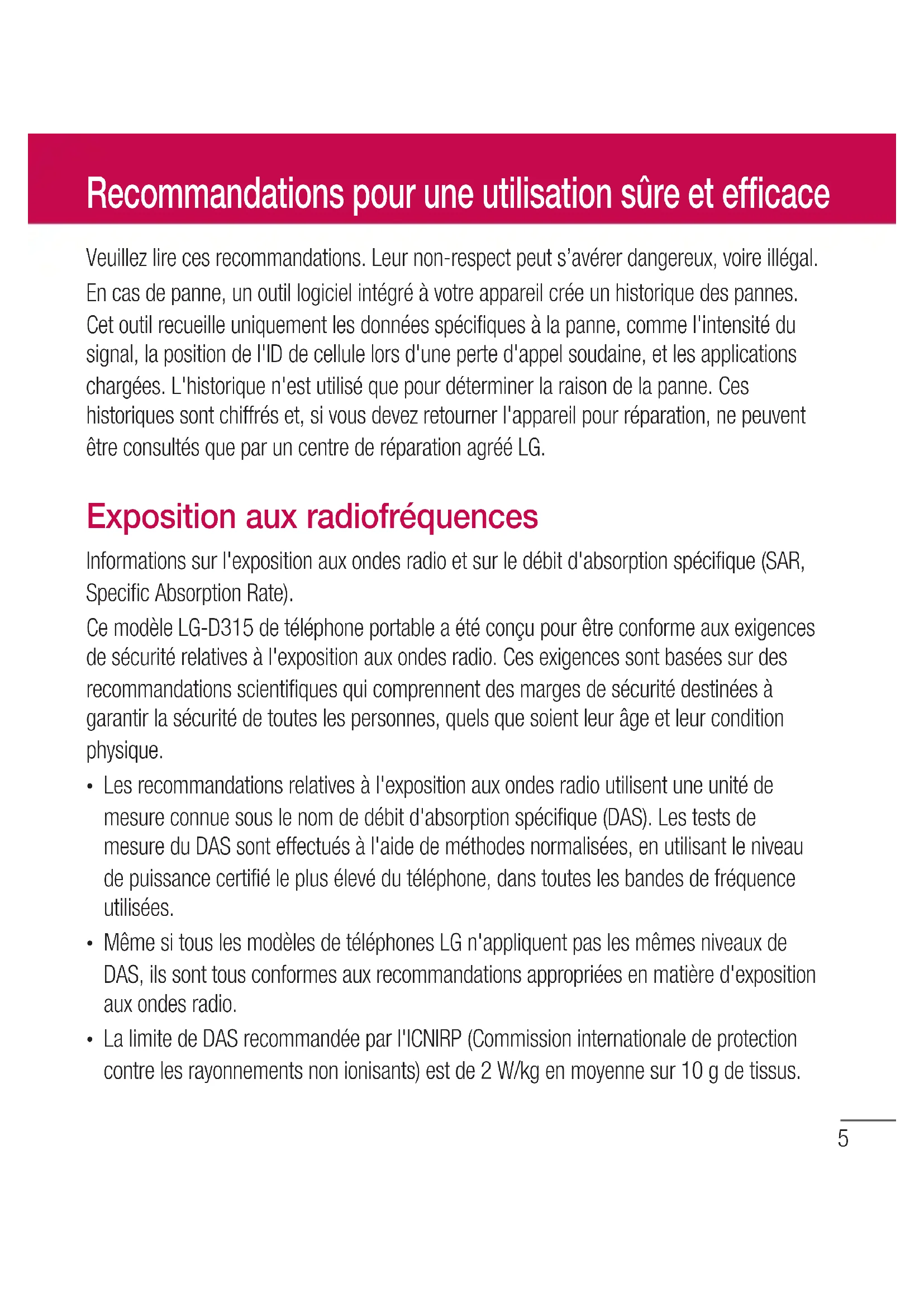 LalimitedeDASrecommandéeparl'ICNIRP(Commissioninternationaledeprotection contrelesrayonnementsnonionisants)estde2W/kgenmoyennesur10gdetissus. Recommandations pour une utilisation sûre et efficace6