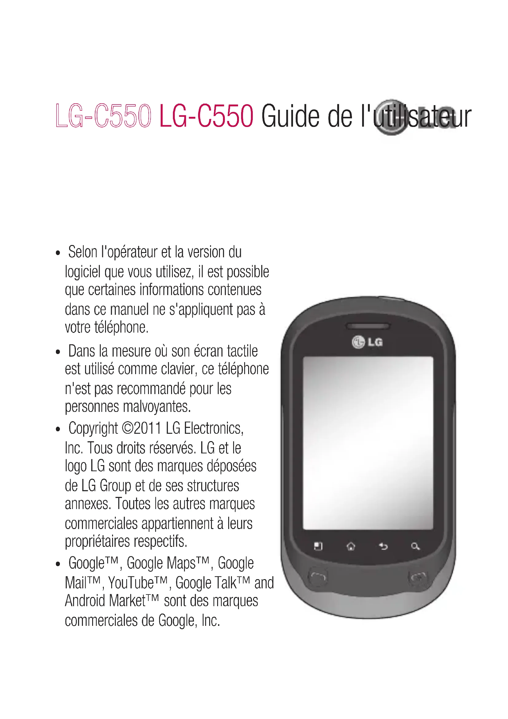 - Google™, Google Maps™, Google Mail™, YouTube™, Google Talk™ and Android Market™ sont des marques commerciales de Google, Inc. LG-C550 LG-C550 Guide de l'utilisateurSo Ave À li télé Pré
