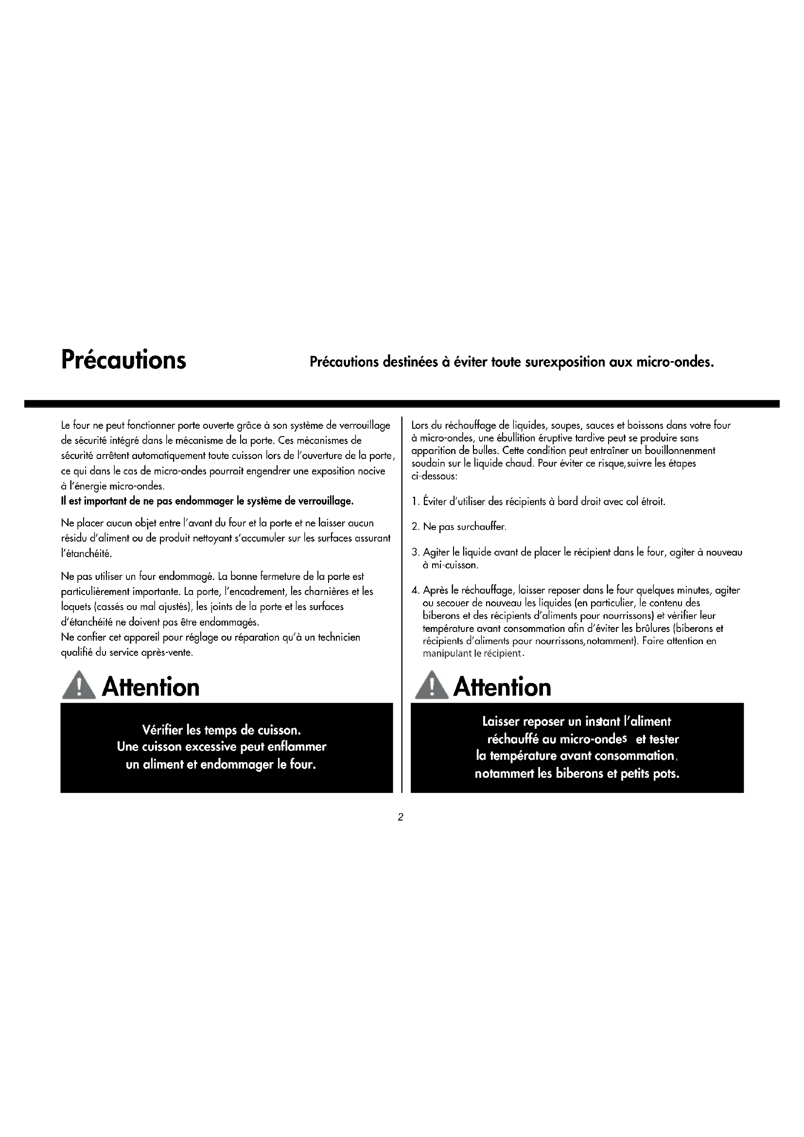MS2342D Power Input Output Microwave Frequency Outside Dimension 220V AC / 50Hz 800 W (IEC60705 rating standard) 2,450 MHz 485 mm(W) X 280mm(H) X 385 mm(D) 1,200 Watts Power Consumption MicrowaveMANUEL DE L’UTILISATEUR FOUR À MICRO-ONDES AVEC GRIL LISEZ ATTENTIVEMENT LE PRESENT MANUEL DE L’UTILISATEUR AVANT D’UTILISER L’APPAREIL. www.lg.com FRENCH MS2342D P/No. : MFL67715001Please ensure cooking times are correctly set as over cooking may result in the FOOD catching fire and subsequent damage to your oven. Précautions destinées à éviter toute surexposition aux micro-ondes. Précautions Le four ne peut fonctionner porte ouverte grâce à son système de verrouillage de sécurité intégré dans le mécanisme de la porte. Ces mécanismes de sécurité arrêtent automatiquement toute cuisson lors de l’ouverture de la porte à l’énergie micro-ondes. Il est important de ne pas endommager le système de verrouillage. Ne placer aucun objet entre l’avant du four et la porte et ne laisser aucun résidu d’aliment ou de produit nettoyant s’accumuler sur les surfaces assurant l’étanchéité. Ne pas utiliser un four endommagé. La bonne fermeture de la porte est particulièrement importante. La porte, l’encadrement, les charnières et les loquets (cassés ou mal ajustés), les joints de la porte et les surfaces d’étanchéité ne doivent pas être endommagés. Ne confier cet appareil pour réglage ou réparation qu’à un technicien qualifié du service après-vente. Lors du réchauffage de liquides, soupes, sauces et boissons dans votre four à micro-ondes, une ébullition éruptive tardive peut se produire sans apparition de bulles. Cette condition peut entraîner un bouillonnenment soudain sur le liquide chaud. Pour éviter ce risque suivre les étapes ci-dessous: