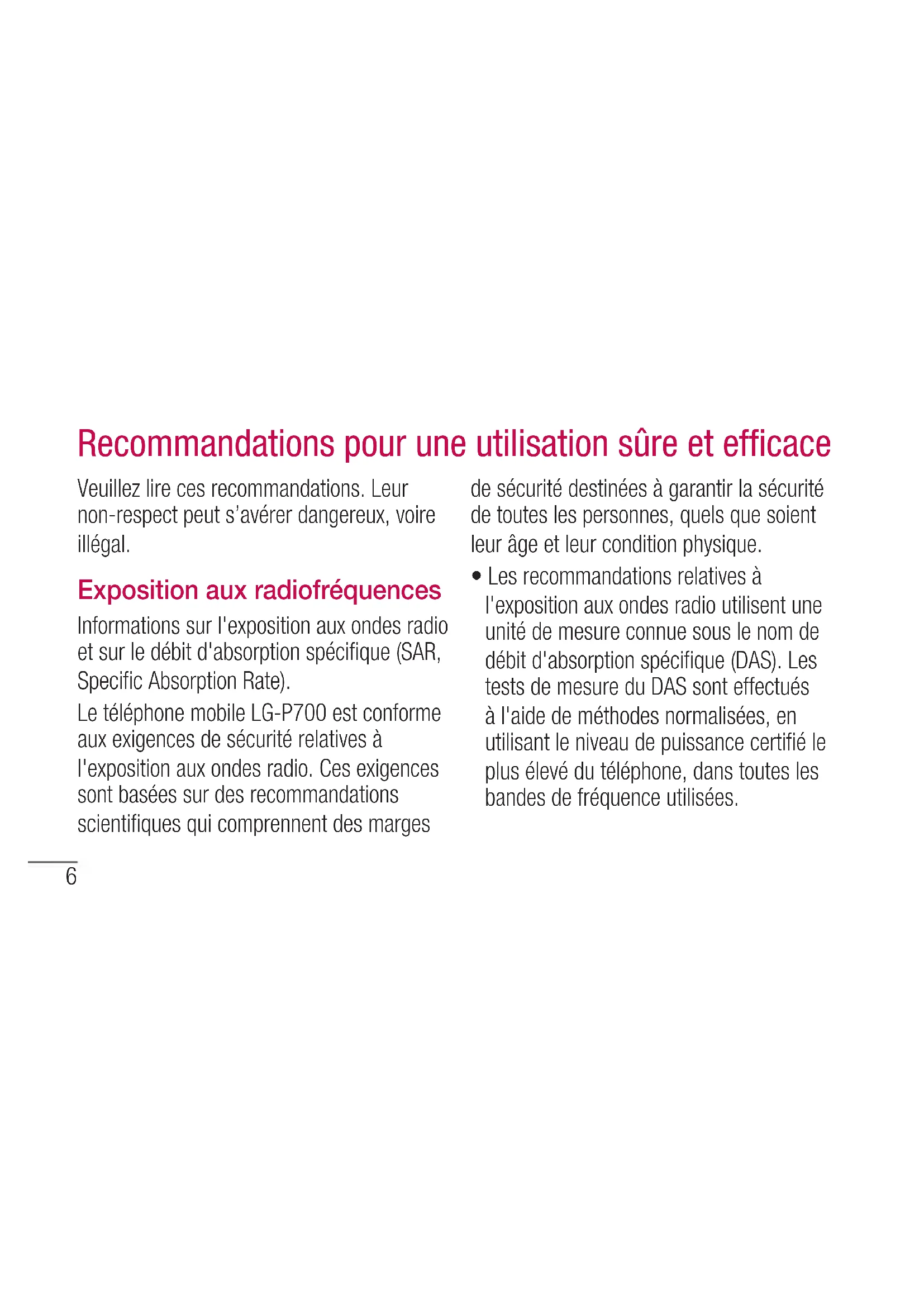 - Google™,GoogleMaps™,Gmail™,YouTube™,GoogleTalk™etPlay Store™sontdesmarquescommercialesdeGoogle,Inc. FRANÇAIS2 Recommandations pour une utilisation sûre et efficace ......................................... 6 Présentation du téléphone ......................22 Composantsdel'appareil............................35 InstallationdelacarteSIMetdelabatterie..38 Chargementdelabatterie...........................40 Utilisationdelacartemémoire.....................41 Verrouillageetdéverrouillagedel'écran.......44 Sécuriservotreécrandeverrouillage...........45 Votre écran d'accueil .............................. 47 Conseilsd'utilisationdel'écrantactile..........47 Accueil.......................................................48 Personnalisationdel'écrand'accueil...........49 Retouràuneapplicationrécemment utilisée.......................................................51 Barredenotication....................................51 Afchagedelabarred'état.........................52 Claviervisuel..............................................56 Saisiedeslettresaccentuées......................57 Configuration d'un compte Google ......... 58 Connexion à des réseaux et périphériques ......................................... 59 Wi-Fi..........................................................59 ConnexionauxréseauxWi-Fi.......................59 Bluetooth...................................................61 Partagedevotreconnexiondedonnées Sommaire3 mobile.......................................................63 Attributiond'unnouveaunomou sécurisationdevotrepointd'accèsmobile...65 UtilisationdeladiffusionWi-Fi.....................67 ActivationdeWi-FiDirectpourlepartage viaSmartShare...........................................68 UtilisationdeSmartShare............................70 Appels ..................................................... 76 Émissiond'unappel....................................76 Appeldescontacts.....................................76 Réponseàunappeletrejetd'unappel........77 Réglageduvolumependantl'appel.............77 Émettreunsecondappel.............................78 Afchagedesjournauxd'appel....................79 Paramètresd'appel....................................79 Répertoire ............................................... 83 Recherched'uncontact..............................83 Ajoutd'unnouveaucontact.........................83 Contactsfavoris..........................................84 Déplacementdecontactsdevotreancien appareilversvotreappareilactuel................85 Messagerie ............................................. 87 Envoid'unmessage....................................87 Boîteclassée.............................................88 Utilisationdesémoticônes...........................89 Modicationdesparamètresdemessage....89 E-mail ..................................................... 904 Sommaire Gestiond'uncomptedemessagerie............90 Écranducomptedemessagerie..................91 Utilisationdesdossiersdecomptes.............92 Compositionetenvoid'une-mail.................92 Photo ...................................................... 94 Familiarisationavecleviseur.......................94 Prisedevuerapide....................................95 Lorsquelaphotoestprise...........................95 Utilisationdesparamètresavancés..............97 Caméra vidéo ........................................ 101 Familiarisationavecleviseur.....................101 Enregistrementd'unevidéorapide.............102 Aprèsavoirenregistréunevidéo................102 Utilisationdesparamètresavancés............103 Réglageduvolumelorsdelalectured'une vidéo........................................................104 Multimédia ............................................ 105 Galerie.....................................................105 Lecteuraudio...........................................105 Transfertdechiersmusicauxdepuisun périphériquedestockageUSB...................105 Lectured'unechanson..............................106 RadioFM.................................................108 Recherchedestations...............................109 LG Tag+ ................................................. 111 NFC.........................................................1115 LGTag+...................................................113 LG SmartWorld ...................................... 115 AccèsàLGSmartWorldàpartird'un téléphone.................................................115 UtilisationdeLGSmartWorld.....................116 Utilitaires .............................................. 118 Réglagedesalarmes................................118 Utilisationdelacalculatrice.......................118 Ajoutd'unévénementaucalendrier...........119 PolarisOfce............................................120 Le web .................................................. 121 Navigateur................................................121 Utilisationdelabarred'outilsWeb.............121 Utilisationdesoptions...............................122 Paramètres ........................................... 123 SANSFILETRÉSEAUX..............................123 DISPOSITIF...............................................127 PERSONNEL.............................................131 SYSTÈME.................................................134 Miseàjourdulogicieldutéléphone...........135 DivXMobile ..............................138 Accessoires .......................................... 140 Dépannage............................................ 1416 Recommandations pour une utilisation sûre et efficace Veuillezlirecesrecommandations.Leur non-respectpeuts’avérerdangereux,voire illégal. Exposition aux radiofréquences Informationssurl'expositionauxondesradio etsurledébitd'absorptionspécifique(SAR, SpecificAbsorptionRate). LetéléphonemobileLG-P700estconforme auxexigencesdesécuritérelativesà l'expositionauxondesradio.Cesexigences sontbaséessurdesrecommandations scientifi