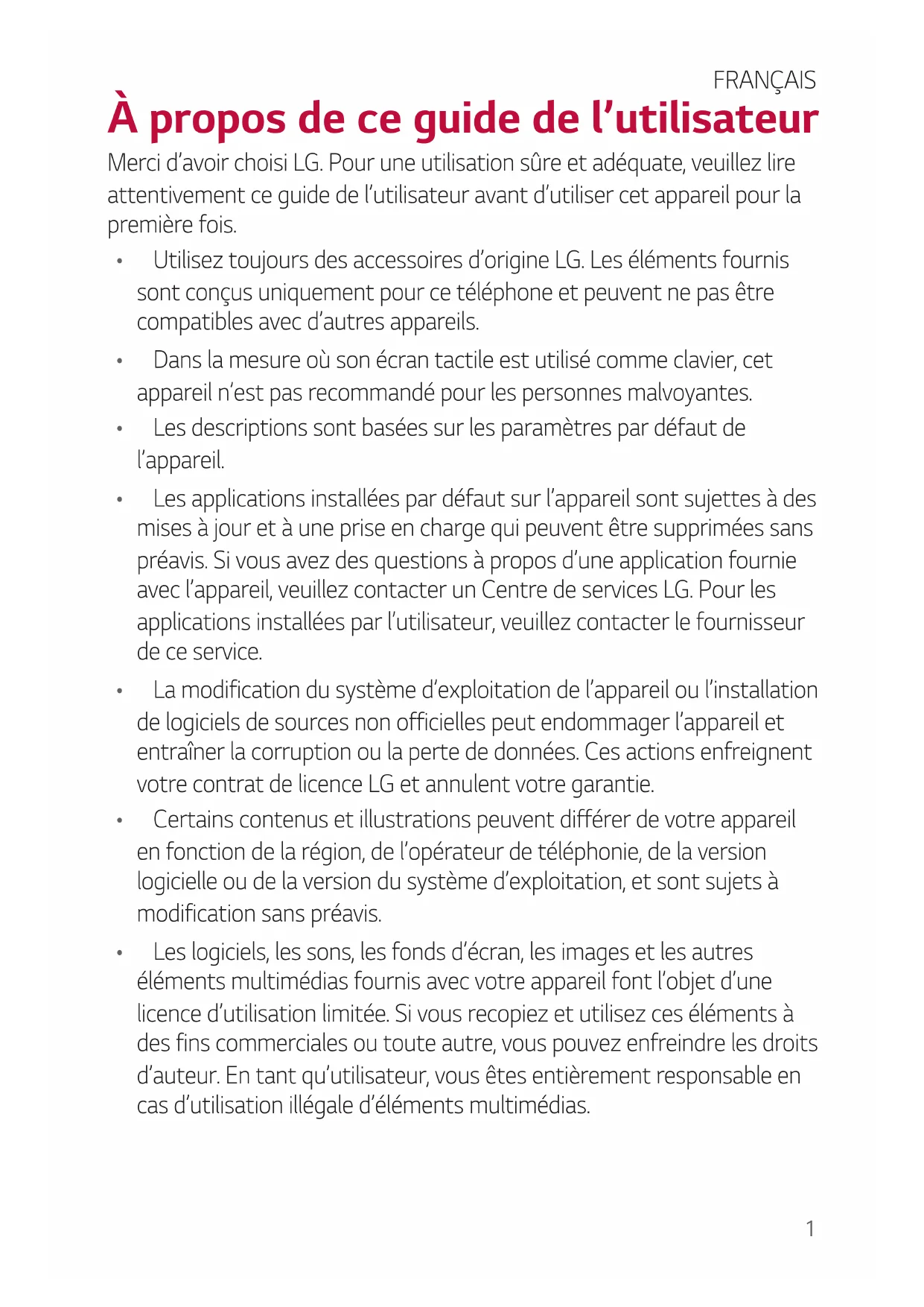 - Les logiciels, les sons, les fonds d’écran, les images et les autres éléments multimédias fournis avec votre appareil font l’objet d’une licenced’utilisationlimitée.Sivousrecopiezetutilisezcesélémentsà des fins commerciales ou toute autre, vous pouvez enfreindre les droits d’auteur. En tant qu’utilisateur, vous êtes entièrement responsable en cas d’utilisation illégale d’éléments multimédias. FRANÇAIS2À propos de ce guide de l’utilisateur