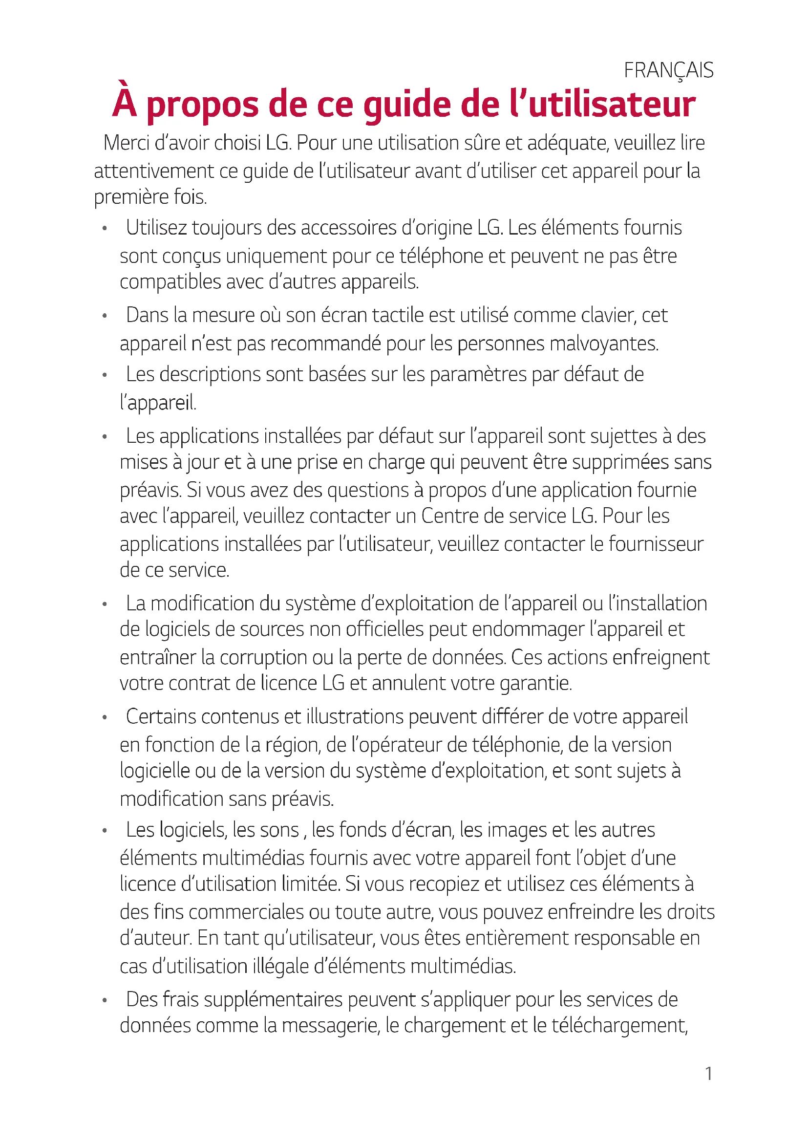 accumulators, please contact your city office, waste disposal service or the shop where you purchased the product.1 À propos de ce guide de l’utilisateur Merci d’avoir choisi LG. Pour une utilisation sûre et adéquate, veuillez lire attentivement ce guide de l’utilisateur avant d’utiliser cet appareil pour la première fois.