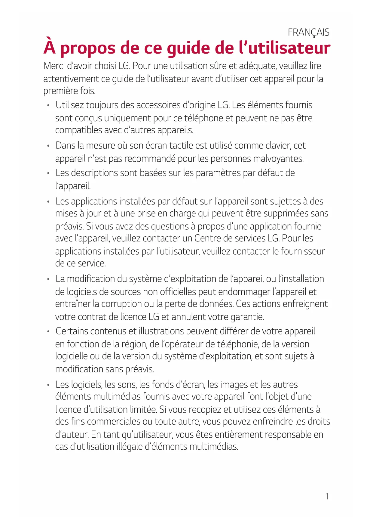 - Les logiciels, les sons, les fonds d’écran, les images et les autres éléments multimédias fournis avec votre appareil font l’objet d’une licenced’utilisationlimitée.Sivousrecopiezetutilisezcesélémentsà des fins commerciales ou toute autre, vous pouvez enfreindre les droits d’auteur. En tant qu’utilisateur, vous êtes entièrement responsable en cas d’utilisation illégale d’éléments multimédias. FRANÇAIS2À propos de ce guide de l’utilisateur