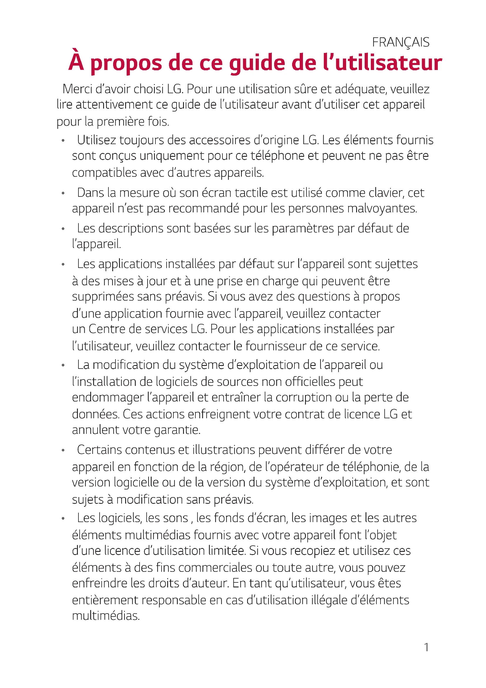 - La modification du système d’exploitation de l’appareil ou l’install ation de logiciels de sources non officielles peut endommager l’appareil et entraîner la corruption ou la perte de données. Ces actions enfreignent votre contrat de licence LG et annulent votre garantie.