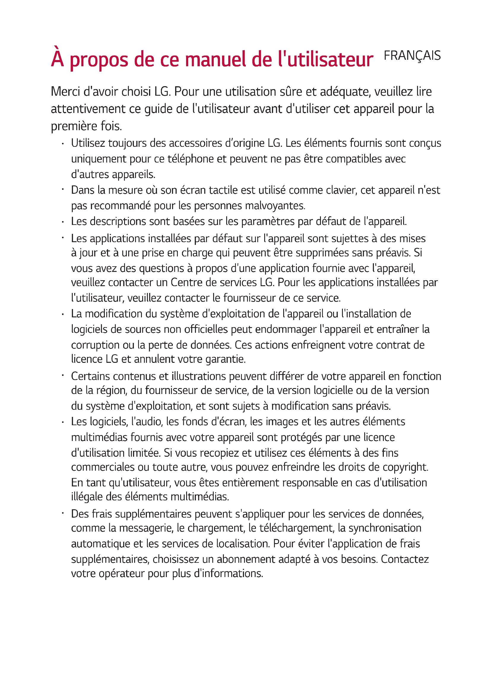Recyclage des batteries/accumulateurs usagés 1 Ce symbole peut être associé aux symboles chimiques du mercure (Hg), du cadmium (Cd) ou du plomb (Pb) si la batteriecontientplusde0,0005%demercure,0,002% decadmiumou0,004%deplomb. 2 Les batteries/accumulateurs doivent être jetés séparément, dans les déchetteries prévues à cet effet par votre municipalité ou être rapportés dans un magasin de téléphonie mobile. 3 La mise au rebut de vos batteries/accumulateurs dans une poubelle appropriée ou dans un magasin de téléphonie mobile aidera à réduire les risques pour l’environnement et votre santé. 4 Pour plus d’informations concernant le recyclage de vos batteries/accumulateurs, veuillez contacter votre mairie, le service des ordures ménagères ou encore le magasin où vous avez acheté ce produit.Informazioni su questa guida per l'utente Grazie per aver scelto LG. Leggere attentamente la guida utente prima di utilizzare il dispositivo per la prima volta al fine di garantire un uso corretto e sicuro.