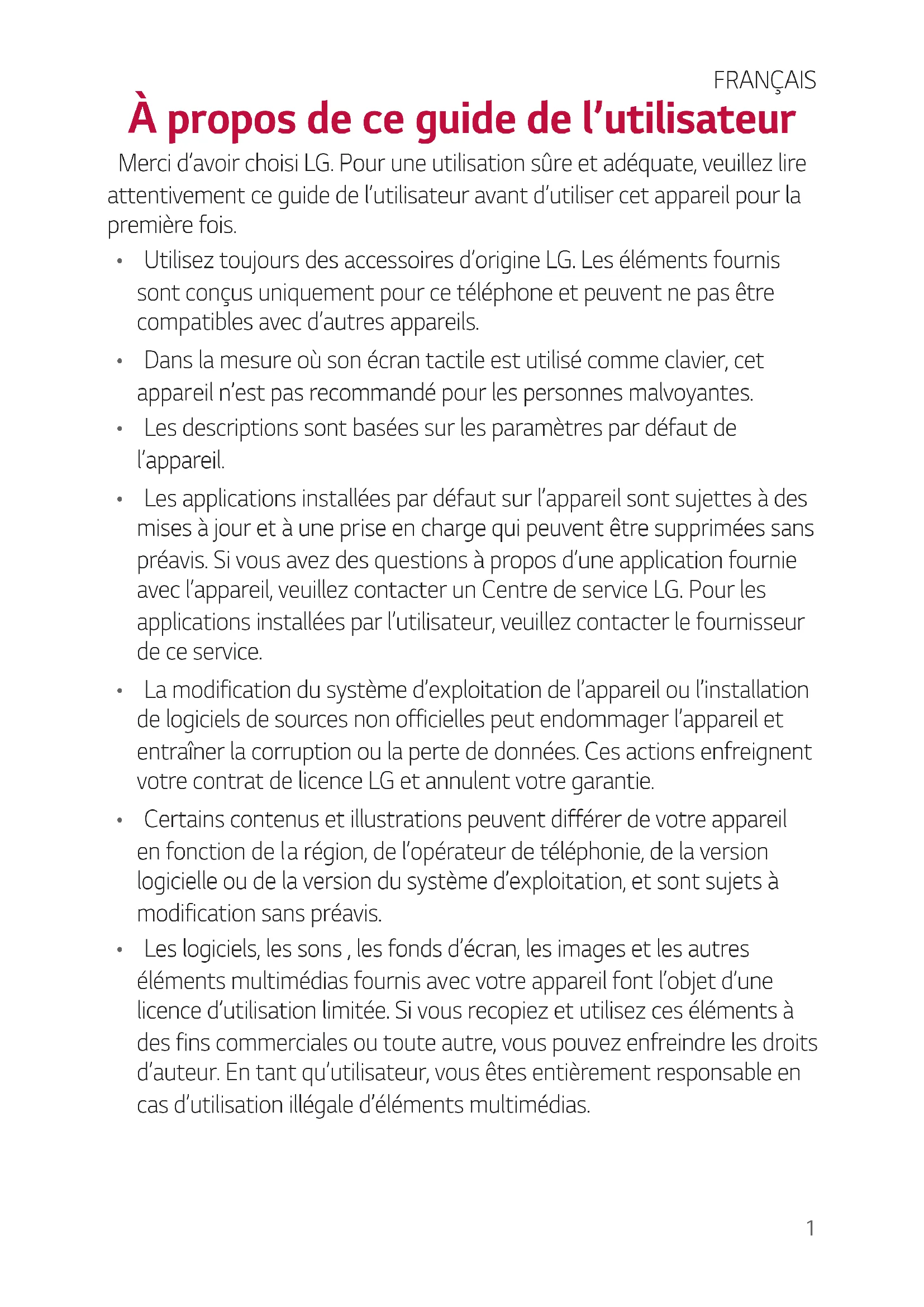 accumulators, please contact your city office, waste disposal service or the shop where you purchased the product.1 À propos de ce guide de l’utilisateur Merci d’avoir choisi LG. Pour une utilisation sûre et adéquate, veuillez lire attentivement ce guide de l’utilisateur avant d’utiliser cet appareil pour la première fois.