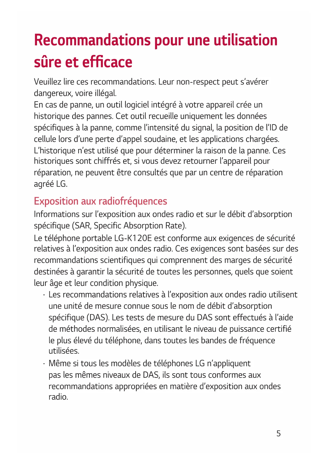 Contactez notre service pour connaître les normes auxquelles ce produit est conforme: .........................................................................895 Recommandations pour une utilisation sûre et efcace Veuillez lire ces recommandations. Leur non-respect peut s’avérer dangereux, voire illégal. En cas de panne, un outil logiciel intégré à votre appareil crée un historique des pannes. Cet outil recueille uniquement les données spécifiques à la panne, comme l’intensité du signal, la position de l’ID de cellule lors d’une perte d’appel soudaine, et les applications chargées. L’historique n’est utilisé que pour déterminer la raison de la panne. Ces historiques sont chiffrés et, si vous devez retourner l’appareil pour réparation, ne peuvent être consultés que par un centre de réparation agréé LG. Exposition aux radiofréquences Informations sur l’exposition aux ondes radio et sur le débit d’absorption spécifique (SAR, Specific Absorption Rate). Le téléphone portable LG-K120E est conforme aux exigences de sécurité relatives à l’exposition aux ondes radio. Ces exigences sont basées sur des recommandations scientifiques qui comprennent des marges de sécurité destinées à garantir la sécurité de toutes les personnes, quels que soient leur âge et leur condition physique.