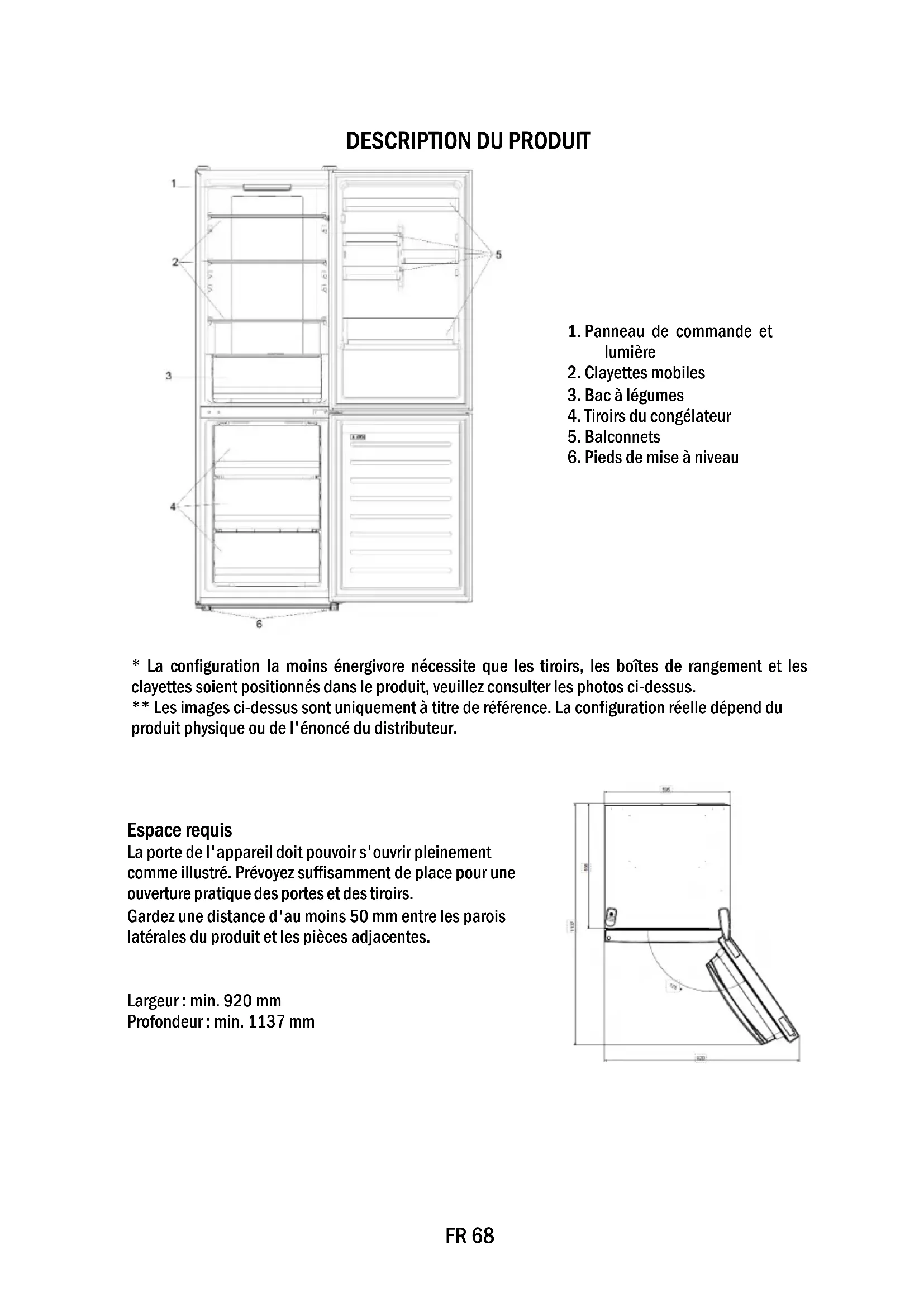 - La configuration la moins énergivore nécessite que les tiroirs, les boîtes de rangement et les clayettes soient positionnés dans le produit, veuillez consulter les photos ci-dessus. ** Les images ci-dessus sont uniquement à titre de référence. La configuration réelle dépend du produit physique ou de l'énoncé du distributeur. Espace requis La porte de l'appareil doit pouvoir s'ouvrir pleinement comme illustré. Prévoyez suffisamment de place pour une ouverture pratique des portes et des tiroirs. Gardez une distance d'au moins 50 mm entre les parois latérales du produit et les pièces adjacentes. Largeur : min. 920 mm Profondeur : min. 1137 mmFR 69 UTILISATION ➀ Touche Marche/Arrêt, utilisée pour allumer/éteindre l'appareil. ➁ Touche SET, utilisée pour sélectionner la température du réfrigérateur ou les fonctions spéciales comme. ➂ L'icône Super refroidissement indique si la fonction est activée. ➃ Niveaux de température, indiquant quelle est la température sélectionnée. Utilisation
