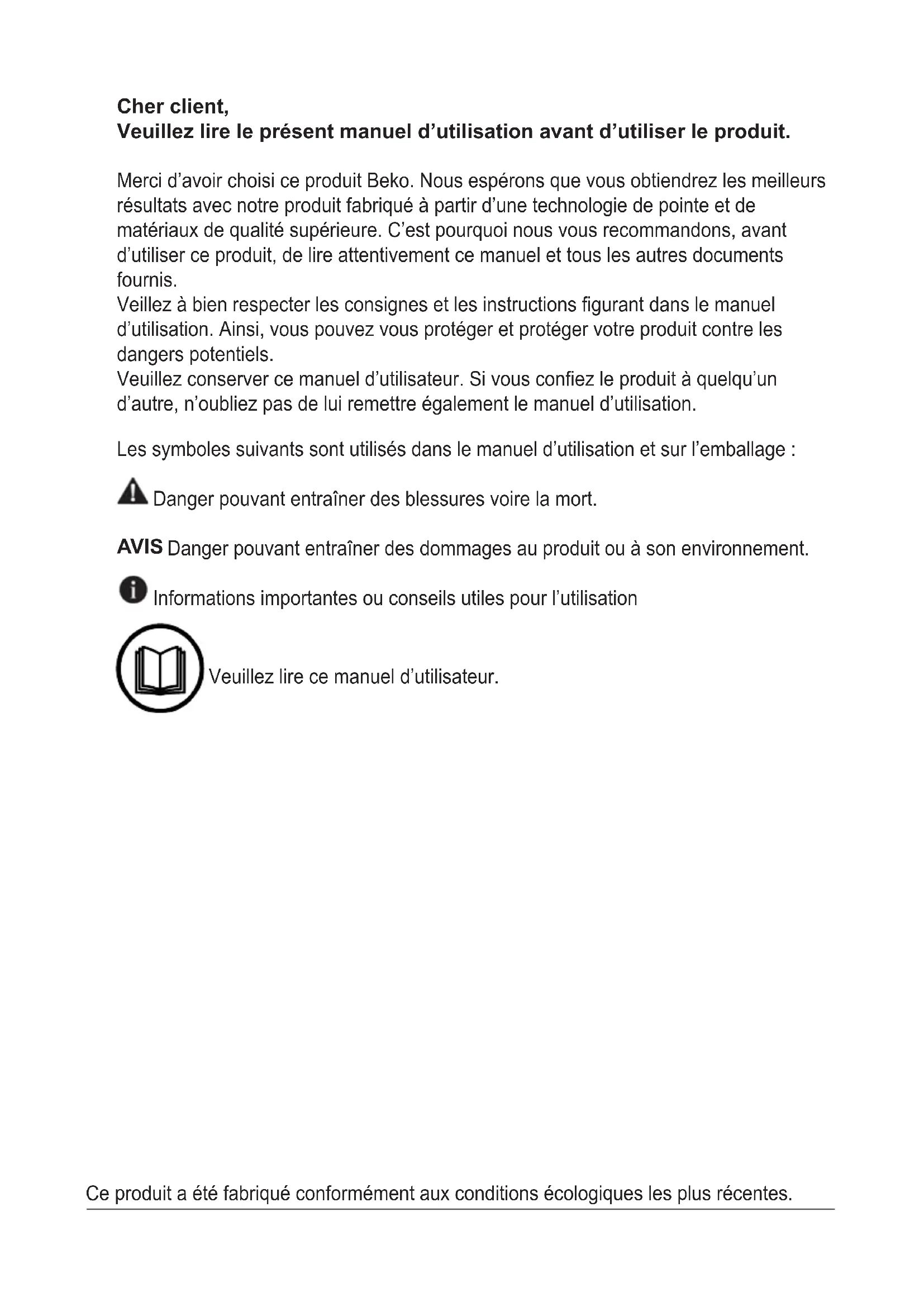 Lave-vaisselle Mode d’emploi 15 8723 0300_BEKO_B7_FR/ 06-04-22.(8:13) BDFN... DFN...Les symboles suivants sont utilisés dans le manuel d’utilisation et sur l’emballage : Danger pouvant entraîner des blessures voire la mort. AVIS Danger pouvant entraîner des dommages au produit ou à son environnement. Informations importantes ou conseils utiles pour l’utilisation Veuillez lire ce manuel d’utilisateur. Cher client, Veuillez lire le présent manuel d’utilisation avant d’utiliser le produit. Merci d’avoir choisi ce produit Beko. Nous espérons que vous obtiendrez les meilleurs résultats avec notre produit fabriqué à partir d’une technologie de pointe et de matériaux de qualité supérieure. C’est pourquoi nous vous recommandons, avant d’utiliser ce produit, de lire attentivement ce manuel et tous les autres documents fournis. Veillez à bien respecter les consignes et les instructions figurant dans le manuel d’utilisation. Ainsi, vous pouvez vous protéger et protéger votre produit contre les dangers potentiels. Veuillez conserver ce manuel d’utilisateur. Si vous confiez le produit à quelqu’un d’autre, n’oubliez pas de lui remettre également le manuel d’utilisation. Ce produit a été fabriqué conformément aux conditions écologiques les plus récentes.TABLE DES MATIÈRES