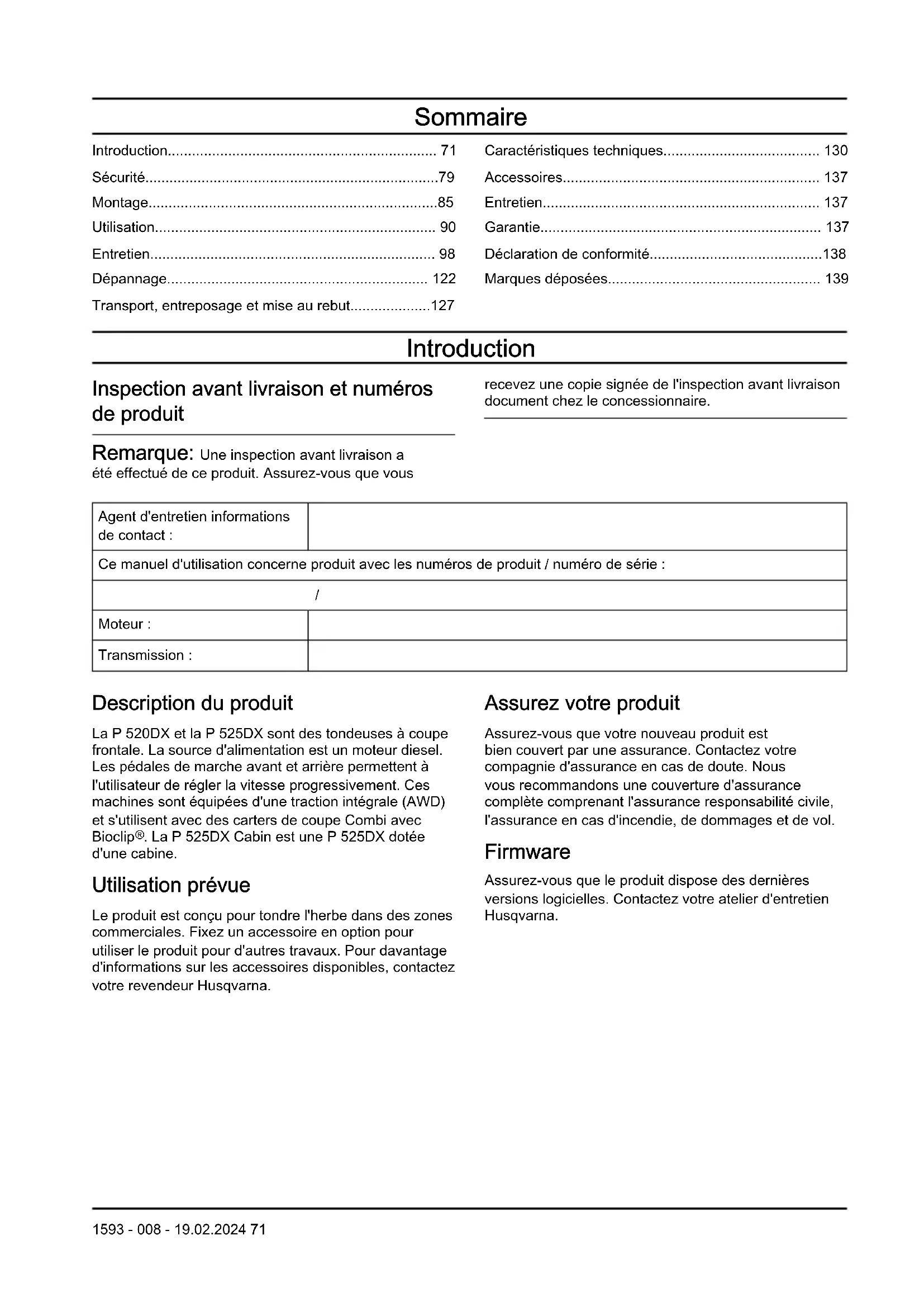 . La P 525DX Cabin est une P 525DX dotée d'une cabine. Utilisation prévue Le produit est conçu pour tondre l'herbe dans des zones commerciales. Fixez un accessoire en option pour utiliser le produit pour d'autres travaux. Pour davantage d'informations sur les accessoires disponibles, contactez votre revendeur Husqvarna. Assurez votre produit Assurez-vous que votre nouveau produit est bien couvert par une assurance. Contactez votre compagnie d'assurance en cas de doute. Nous vous recommandons une couverture d'assurance complète comprenant l'assurance responsabilité civile, l'assurance en cas d'incendie, de dommages et de vol. Firmware Assurez-vous que le produit dispose des dernières versions logicielles. Contactez votre atelier d'entretien Husqvarna. 1593 - 008 - 19.02.2024 71Présentation du produit (P 520DX, P 525DX)