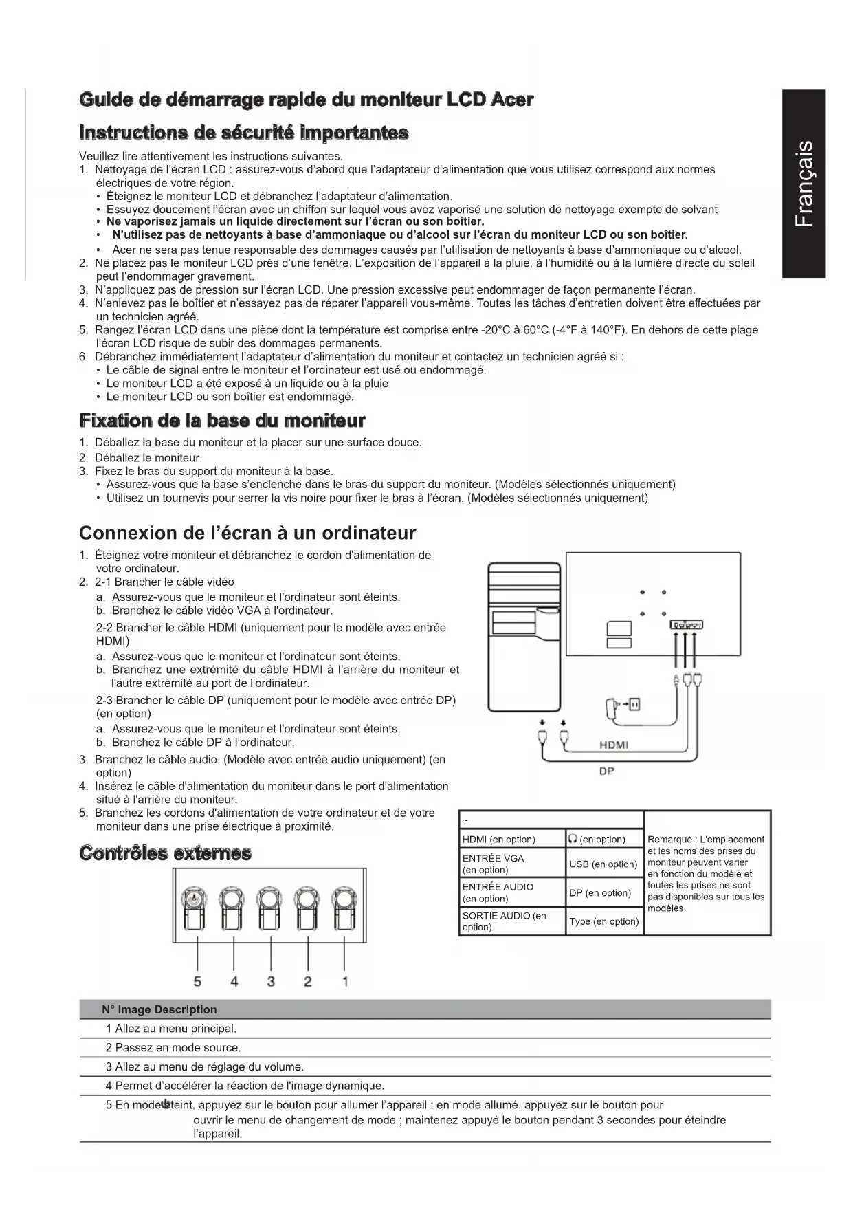 - El consumo de energía anual se calcula a partir del consumo de energía típico de 4 horas al día, los 365 días del año.Français Guide de démarrage rapide du moniteur LCD Acer Instructions de sécurité importantes Veuillez lire attentivement les instructions suivantes. 1. Nettoyage de l’écran LCD : assurez-vous d’abord que l’adaptateur d’alimentation que vous utilisez correspond aux normes électriques de votre région.