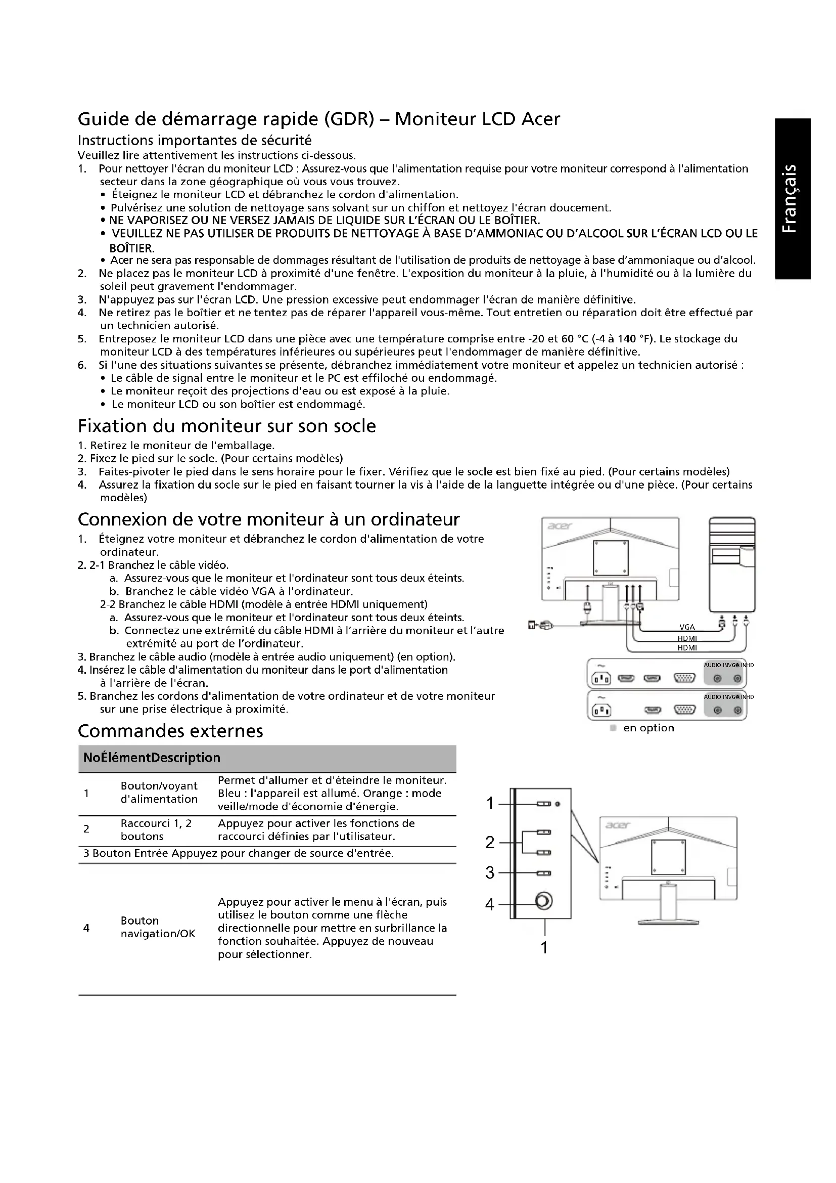 ordinateur.2. 2-1 Branchez le câble vidéo.a. Assurez-vous que le moniteur et l'ordinateur sont tous deux éteints.b. Branchez le câble vidéo VGA à l'ordinateur. 2-2 Branchez le câble HDMI (modèle à entrée HDMI uniquement)a. Assurez-vous que le moniteur et l'ordinateur sont tous deux éteints. b. Connectez une extrémité du câble HDMI à l’arrière du moniteur et l’autre extrémité au port de l’ordinateur.3. Branchez le câble audio (modèle à entrée audio uniquement) (en option).4. Insérez le câble d'alimentation du moniteur dans le port d'alimentation à l'arrière de l'écran.5. Branchez les cordons d'alimentation de votre ordinateur et de votre moniteur sur une prise électrique à proximité. Commandes externes No Élément Description