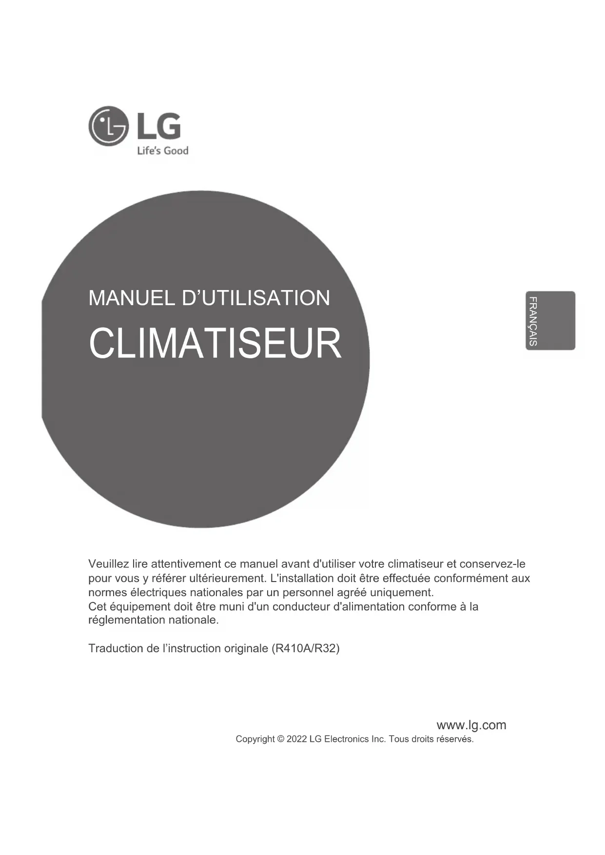 Veuillez lire attentivement ce manuel avant d'utiliser votre climatiseur et conservez-le pour vous y référer ultérieurement. L'installation doit être effectuée conformément aux normes électriques nationales par un personnel agréé uniquement. Cet équipement doit être muni d'un conducteur d'alimentation conforme à la réglementation nationale. Traduction de l’instruction originale (R410A/R32) CLIMATISEUR Copyright © 2022 LG Electronics Inc. Tous droits réservés. FRANÇAIS2 Unité Interieure Table Des Matières