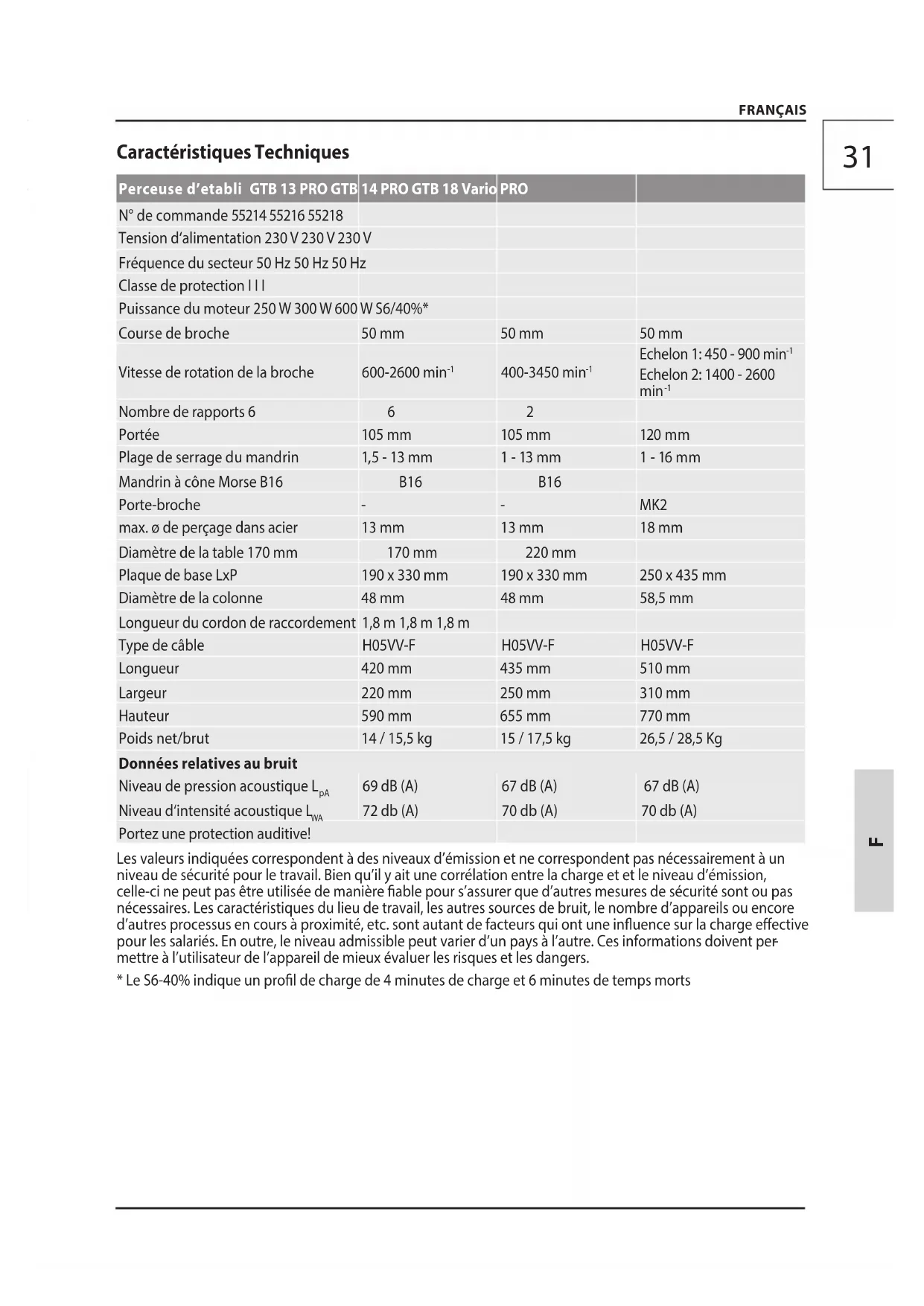 FRANÇAIS Caractéristiques Techniques Perceuse d’etabli GTB 13 PRO GTB 14 PRO GTB 18 Vario PRO N° de commande 55214 55216 55218 Tension d‘alimentation 230 V 230 V 230 V Fréquence du secteur 50 Hz 50 Hz 50 Hz Classe de protection I I I Puissance du moteur 250 W 300 W 600 W S6/40%* Course de broche 50 mm 50 mm 50 mm Vitesse de rotation de la broche 600-2600 min