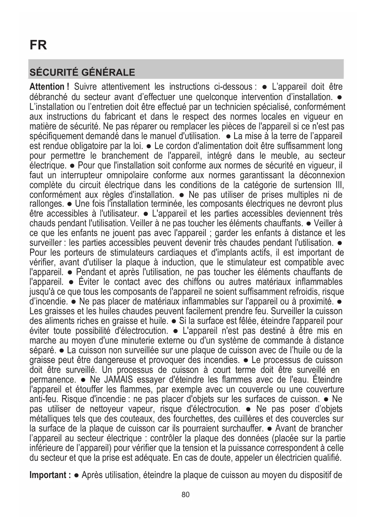 Attention ! Suivre attentivement les instructions ci-dessous : Ɣ L’appareil doit être débranché du secteur avant d’effectuer une quelconque intervention d’installation. Ɣ L’installation ou l’entretien doit être effectué par un technicien spécialisé, conformément aux instructions du fabricant et dans le respect des normes locales en vigueur en matière de sécurité. Ne pas réparer ou remplacer les pièces de l'appareil si ce n'est pas spécifiquement demandé dans le manuel d'utilisation. Ɣ La mise à la terre de l’appareil est rendue obligatoire par la loi. Ɣ Le cordon d'alimentation doit être suffisamment long pour permettre le branchement de l'appareil, intégré dans le meuble, au secteur électrique. Ɣ Pour que l'installation soit conforme aux normes de sécurité en vigueur, il faut un interrupteur omnipolaire conforme aux normes garantissant la déconnexion complète du circuit électrique dans les conditions de la catégorie de surtension III, conformément aux règles d'installation. Ɣ Ne pas utiliser de prises multiples ni de rallonges. Ɣ Une fois l'installation terminée, les composants électriques ne devront plus être accessibles à l'utilisateur. Ɣ L'appareil et les parties accessibles deviennent très chauds pendant l'utilisation. Veiller à ne pas toucher les éléments chauffants. Ɣ Veiller à ce que les enfants ne jouent pas avec l'appareil ; garder les enfants à distance et les surveiller : les parties accessibles peuvent devenir très chaudes pendant l'utilisation. Ɣ Pour les porteurs de stimulateurs cardiaques et d'implants actifs, il est important de vérifier, avant d'utiliser la plaque à induction, que le stimulateur est compatible avec l'appareil. Ɣ Pendant et après l'utilisation, ne pas toucher les éléments chauffants de l'appareil. Ɣ Éviter le contact avec des chiffons ou autres matériaux inflammables jusqu'à ce que tous les composants de l'appareil ne soient suffisamment refroidis, risque d’incendie. Ɣ Ne pas placer de matériaux inflammables sur l'appareil ou à proximité. Ɣ Les graisses et les huiles chaudes peuvent facilement prendre feu. Surveiller la cuisson des aliments riches en graisse et huile. Ɣ Si la surface est fêlée, éteindre l'appareil pour éviter toute possibilité d'électrocution. Ɣ L'appareil n'est pas destiné à être mis en marche au moyen d'une minuterie externe ou d'un système de commande à distance séparé. Ɣ La cuisson non surveillée sur une plaque de cuisson avec de l’huile ou de la graisse peut être dangereuse et provoquer des incendies. Ɣ Le processus de cuisson doit être surveillé. Un processus de cuisson à court terme doit être surveillé en permanence. Ɣ Ne JAMAIS essayer d'éteindre les flammes avec de l'eau. Éteindre l'appareil et étouffer les flammes, par exemple avec un couvercle ou une couverture anti-feu. Risque d'incendie : ne pas placer d'objets sur les surfaces de cuisson. Ɣ Ne pas utiliser de nettoyeur vapeur, risque d'électrocution. Ɣ Ne pas poser d’objets métalliques tels que des couteaux, des fourchettes, des cuillères et des couvercles sur la surface de la plaque de cuisson car ils pourraient surchauffer. Ɣ Avant de brancher l’appareil au secteur électrique : contrôler la plaque des données (placée sur la partie inférieure de l’appareil) pour vérifier que la tension et la puissance correspondent à celle du secteur et que la prise est adéquate. En cas de doute, appeler un électricien qualifié. Important : Ɣ Après utilisation, éteindre la plaque de cuisson au moyen du dispositif de81 commande et ne pas se fier uniquement au détecteur de casseroles. Ɣ Éviter de renverser du liquide ; pour faire bouillir ou chauffer des liquides, réduire l'apport de chaleur. Ɣ Ne pas laisser les éléments chauffants allumés avec des casseroles et des poêles vides, ou encore sans récipients. Ɣ À la fin de la cuisson, éteindre la zone de cuisson correspondante. Ɣ Pour la cuisson, ne jamais utiliser de papier aluminium, et ne jamais poser directement des produits emballés en aluminium. L'aluminium fondrait et endommagerait irrémédiablement votre appareil. Ɣ Ne jamais chauffer une boîte ou une boîte de conserve contenant des aliments sans l'ouvrir : elle pourrait exploser ! Cette mise en garde vaut pour tous les autres types de plaques de cuisson. Ɣ L'utilisation d'une puissance élevée comme la fonction Booster ne convient pas pour le chauffage de liquides tel que l'huile de friture. Une chaleur excessive pourrait être dangereuse. Dans ces cas, il est recommandé d'utiliser une puissance inférieure. Ɣ Les récipients doivent être directement placés sur la plaque de cuisson et être centrés. N'insérer en aucun cas d’autres objets entre la casserole et la plaque de cuisson. Ɣ En cas de températures élevées, l'appareil réduit automatiquement le niveau de puissance des zones de cuisson. Ɣ Avant toute opération de nettoyage ou d'entretien, débrancher l’appareil du réseau électrique en retirant la fiche électrique ou en coupant l'interrupteur général. Ɣ Utiliser des gants de travail pour toutes les opérations d'installation et d'entretien. Ɣ L'appareil peut être utilisé par des enfants de plus de 8 ans et par des personnes aux capacités physiques, sensorielles ou mentales réduites, ou sans l'expérience ni les connaissances nécessaires, à condition d'être surveillés ou d'avoir reçu les instructions relatives à l'utilisation sûre de l'appareil et à la compréhension des risques inhérents. Ɣ Les enfants doivent être contrôlés pour s'assurer qu'ils ne jouent pas avec l'appareil. Ɣ Le nettoyage et l'entretien ne doivent pas être effectués par des enfants sans surveillance. Ɣ La pièce doit être suffisamment aérée quand l’appareil est utilisé simultanément aux autres appareils de combustion au gaz ou autres combustibles. Ɣ L’appareil doit être régulièrement nettoyée à la foi