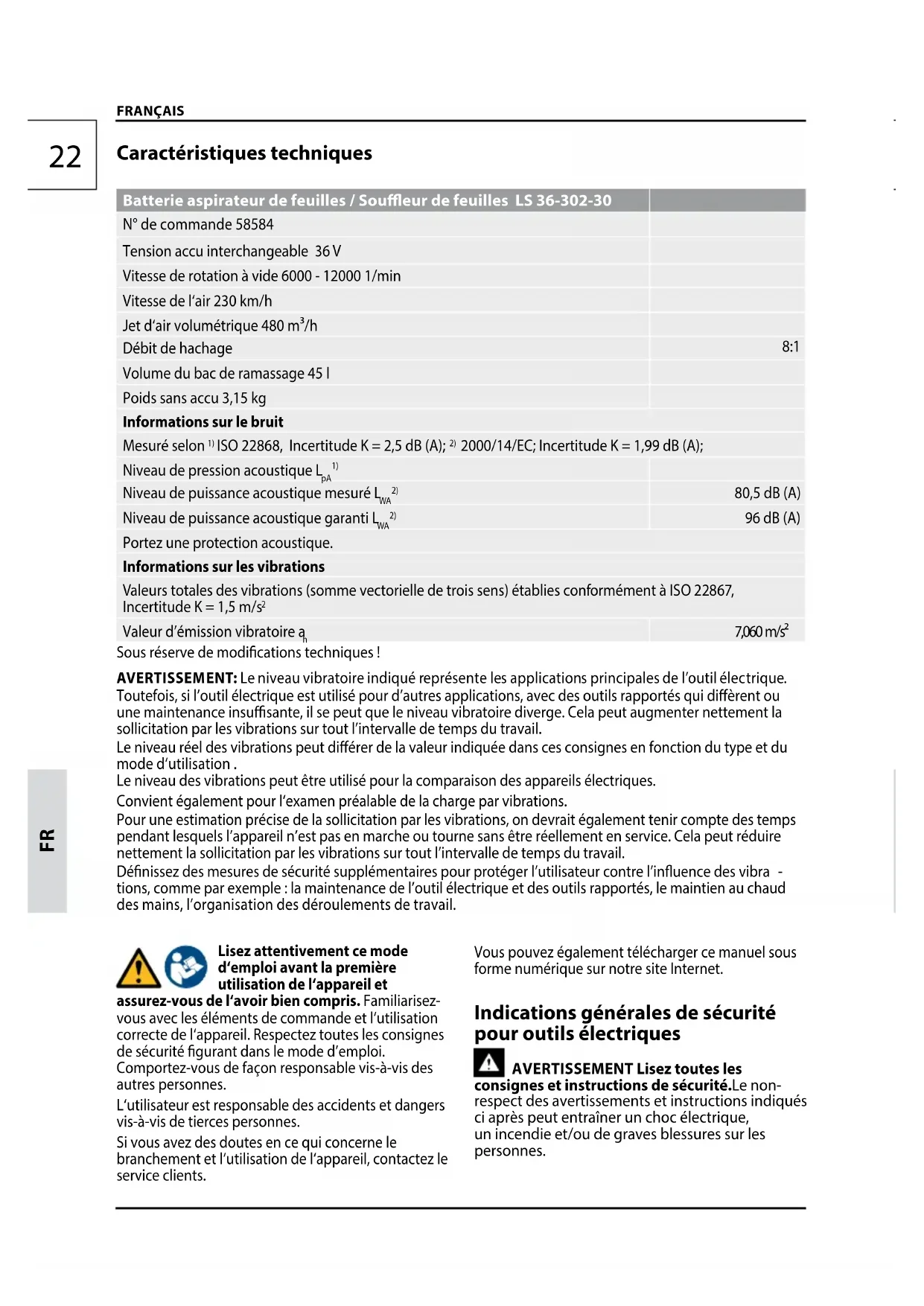 ENGLISH22 Caractéristiques techniques Batterie aspirateur de feuilles / Soueur de feuilles LS 36-302-30 N° de commande 58584 Tension accu interchangeable 36 V Vitesse de rotation à vide 6000 - 12000 1/min Vitesse de l‘air 230 km/h Jet d‘air volumétrique 480 m³/h Débit de hachage 8:1 Volume du bac de ramassage 45 l Poids sans accu 3,15 kg Informations sur le bruit Mesuré selon