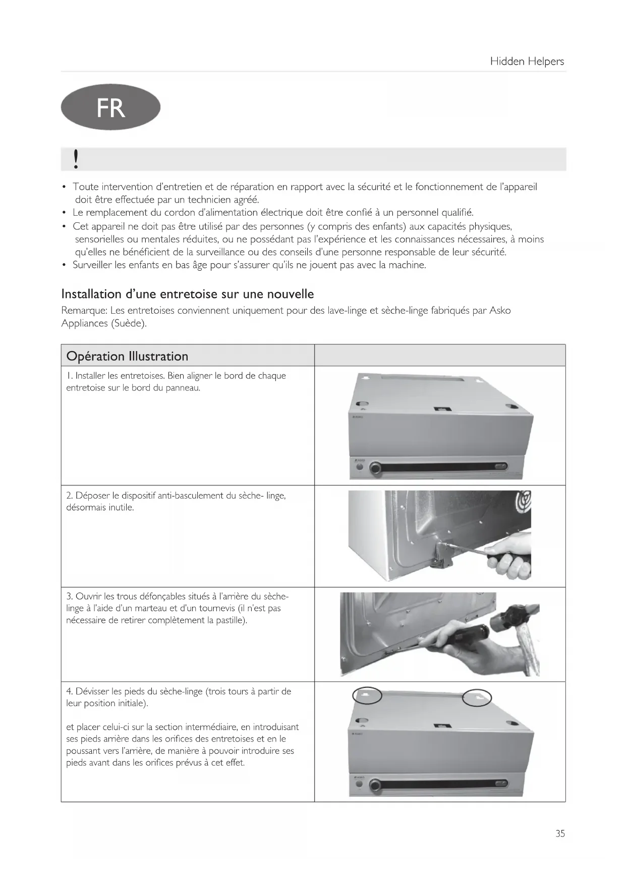 A37 Hidden Helpers Installation de l’entretoise sur des machines déjà Remarque: Les entretoises conviennent uniquement pour des lave-linge et sèche-linge fabriqués par Asko. Opération Illustration