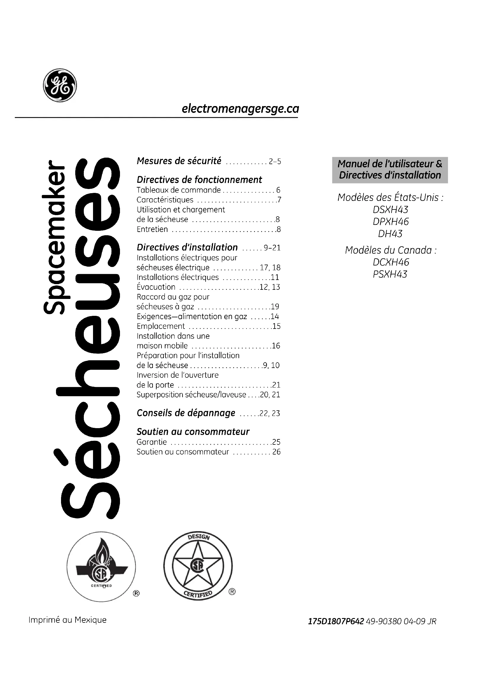 Notes. Conseils de dépannage Fonctionnement Mesures de sécuritéDirectives d’installation Soutien au consommateur25 Conseils de dépannageFonctionnementMesures de sécurité Directives d’installation Soutien au consommateur Garantie de votre sécheuse GE. ■ Toute visite à votre domicile pour vous expliquer lefonctionnement de l’appareil.■ Installation, livraison ou entretien inadéquats.■ Toute défectuosité du produit lorsqu’il est utilisé defaçon abusive, à des fins commerciales ou à toute autrefin que celle pour laquelle il a été conçu.■ Le service s’il est impossible d’avoir accès au produitpour ce faire.■ Le remplacement des fusibles ou le réenclenchement desdisjoncteurs du panneau de distribution.■ Tout dommage au produit attribuable à un accident, unincendie, une inondation ou un cas de force majeure.■ Tout dommage direct ou indirect causé en raisond’une défectuosité éventuelle de cet appareil.■ Tout dommage à la finition qui n’a pas été signalédans les 48 heures qui suivent la livraison del’appareil électroménager. Ce qui n’est pas couvert : Pour une période de : Mabe remplacera : Un an Toute piècede la sécheuse qui se révèle défectueuse en raison d’un vice de matériaux ou À compter de la datede fabrication. Pendant cette garantie limitée de un an, Mabe prendra en charge également, d’achat d’origine gratuitement, tous les frais de main-d’œuvre et les frais connexes de service pour remplacer la pièce défectueuse. EXCLUSION DE GARANTIES IMPLICITES – Votre seul et unique recours est la réparation du produit selon les dispositions de cette Garantie limitée. Toutes les garanties implicites, incluant les garanties de commercialité et d’adéquation à un usage spécifique, sont limitées à une année ou à la période la plus courte autorisée par la législation. Toutes les réparations sous garantie sont effectuées par nos Centres de réparation ou par nos réparateurs Mabe autorisés. Pour obtenir du service en ligne, veuillez nous visiter au site www.electromenagersge.ca ou appelez le no 1.800.561.3344. Veuillez fournir le numéro de série et le numéro de modèle lorsque vous appelez pour obtenir le service. Agrafez le reçu d’achat ici. Pour obtenir le service sousgarantie, vous devrez fournir lapreuve de l’achat original. Cette garantie est valable pour le premier propriétaire et tout autre propriétaire du produit s’il acheté au Canada pour utilisation domestique dans Canada. Le service à domicile sous garantie sera fourni là où il est disponible et dans les régions que Mabe considère que l’offre de service est raisonnable. Dans certaines provinces, il est interdit d’exclure ou de limiter les dommages directs ou indirects. Il est alors possible que les limitations ou exclusions ci-dessus ne s’appliquent pas dans votre cas. La présente garantie vous confère des droits juridiques spécifiques. Vous pouvez bénéficier d’autres droits, qui varient d’une province à l’autre. Pour connaître les droits dont vous bénéficiez dans votre province, communiquez avec le bureau des relations avec les consommateurs de votre région. Garant : Mabe Canada Inc., Burlington, Ontario26 Site Internet GE www .electromenagersge.ca Vous avez une question ou vous avez besoin d’aide pour votre appareil électroménager? Contactez-nous par Internet au site www.electromenagersge.ca 24 heures par jour, tous les jours de l’année. Service de réparations 1.800.561.3344 Service de réparations GE est tout près de vous.Pour faire réparer votre électroménager GE, il suffit de nous téléphoner. Studio de conception réaliste www .electromenagersge.ca Sur demande, GE peut fournir une brochure sur l’aménagement d’une cuisine pour les personnes à mobilité réduite.Écrivez: Directeur, Relations avec les consommateurs, Mabe Canada Inc. Bureau 310, 1 Factory LaneMoncton, N.B. E1C 9M3 Pièces et accessoires www .electromenagersge.ca Ceux qui désirent réparer eux-mêmes leurs électroménagers peuvent recevoir pièces et accessoiresdirectement à la maison (cartes VISA, MasterCard et Discover acceptées).Les directives stipulées dans le présent manuel peuvent être effectuées par n’importe quel utilisateur. Les autresréparations doivent généralement être effectuées par un technicien qualifié. Soyez prudent, car une réparationinadéquate peut affecter le fonctionnement sécuritaire de l’appareil.Vous trouverez dans les pages jaunes de votre annuaire le numéro du Centre de service Mabe le plusproche. Autrement, appelez-nous au 1.800.561.3344. Contactez-nous www .electromenagersge.ca Si vous n’êtes pas satisfait du service après-vente dont vous avez bénéficié : Premièrement, communiquez avec les gens qui ont réparé votre appareil. Ensuite, si vous n’êtes toujours pas satisfait envoyez tous les détails—numéro de téléphone compris—au Directeur, Relations avec les consommateurs, Mabe Canada Inc.Bureau 310, 1 Factory LaneMoncton, N.B. E1C 9M3 Inscrivez votre appareil électroménager www .electromenagersge.ca Inscrivez votre appareil électroménager en direct, aussitôt que possible. Cela améliorera nos communications et notre service après-vente. Vous pouvez également nous envoyer par la poste le formulaire d’inscription joint à votre documentation. Soutien au consommateur. Prolongation de garantie www .electromenagersge.ca Achetez un contrat d’entretien GE avant que votre garantie n’expire et bénéficiez d’un rabais substantiel. Ainsi le service après-vente GE sera toujours là après expiration de la garantie.Visitez notre site Web ou appelez-nous au 1.800.661.1616.