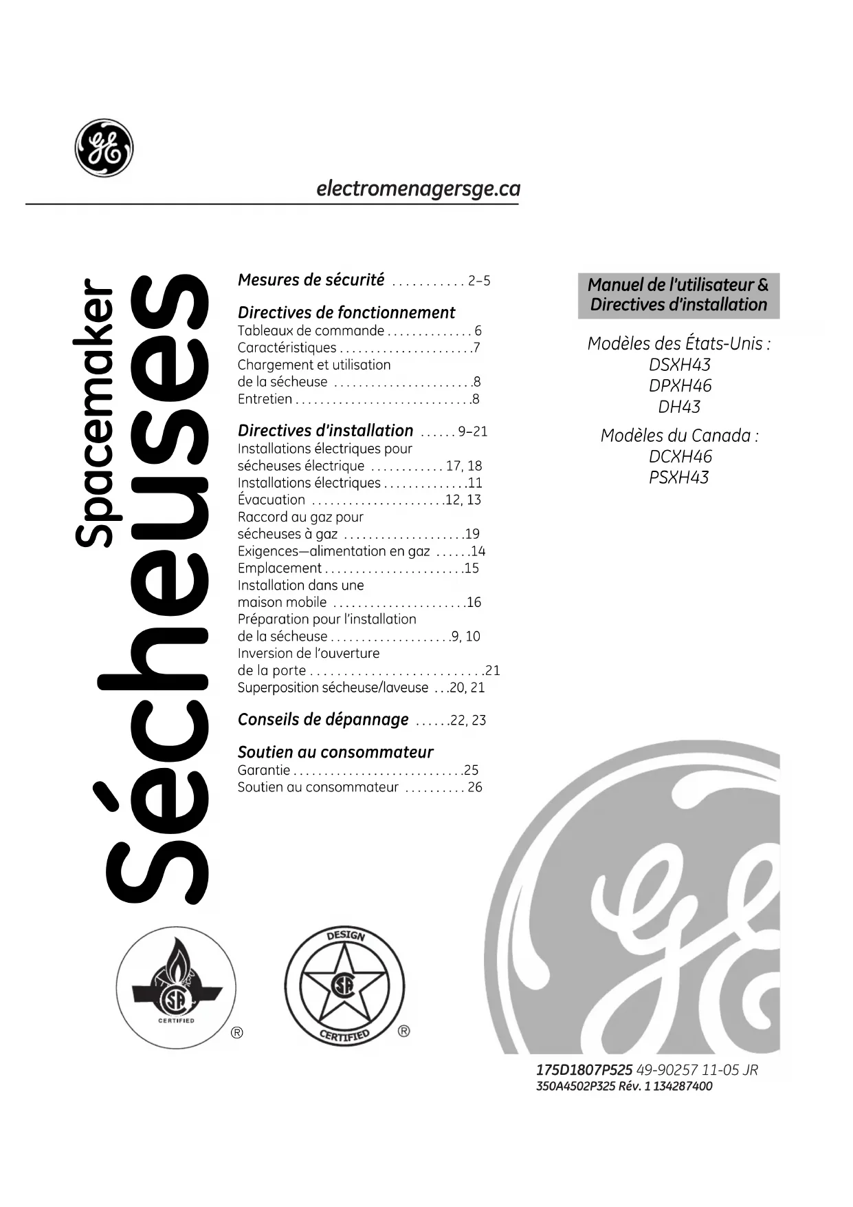 Entretien et nettoyage de la sécheuseDirectives Sécheuse Spacemaker d’installation Modèles DCXH46 DSXH43 DPXH46 DH43 PSXH43 Questions? Visitez notre site Web à : electromenagersge.ca ou appelez le 1.800.361.3400 AVANT DE COMMENCER : Lire attentivement la totalité de ces instructions.