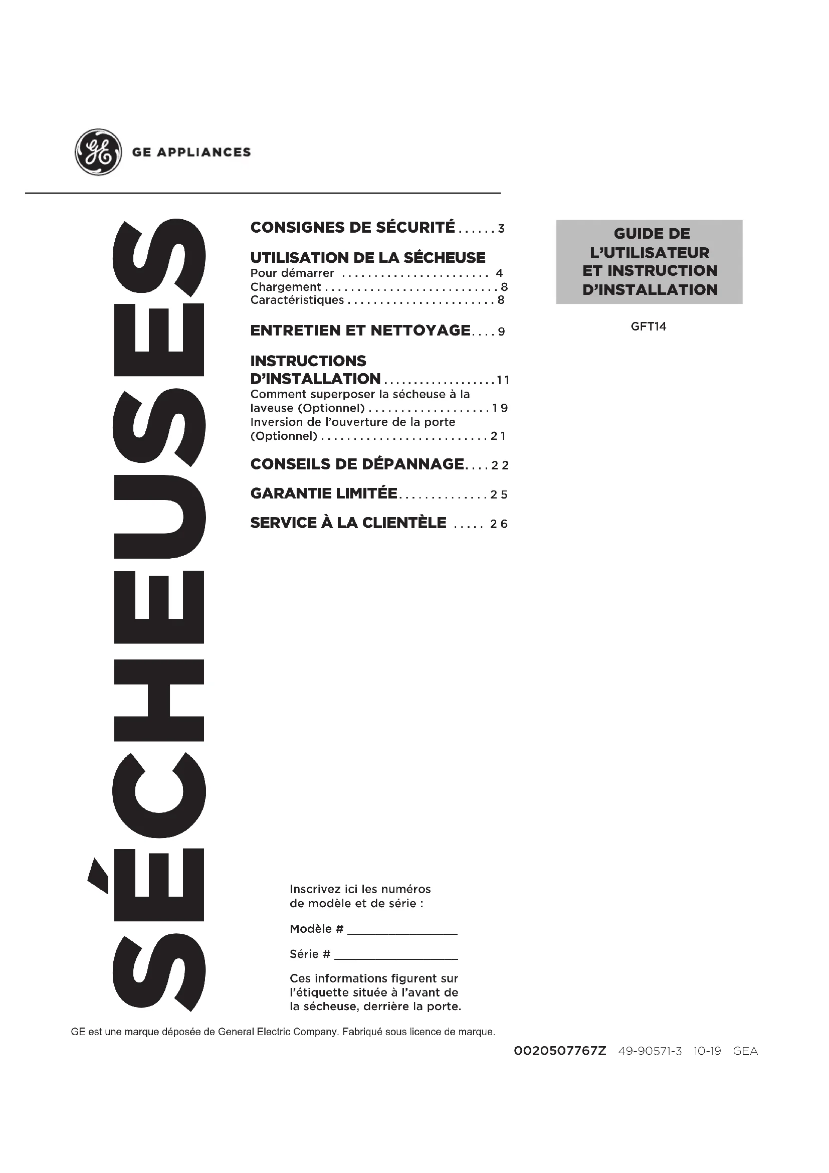 GUIDE DE L’UTILISATEUR ET INSTRUCTION D’INSTALLATION Inscrivez ici les numéros de modèle et de série : Modèle # ________________ Série # __________________ Ces informations figurent sur l’étiquette située à l’avant de la sécheuse, derrière la porte. GFT14 0020507767Z 49-90571-3 10-19 GEA2 49-90571-3 NOUS VOUS REMERCIONS D’ACCUEILLIR GE APPLIANCES CHEZ VOUS Que vous ayez grandi avec GE Appliances ou qu’il s’agisse de votre première acquisition, nous sommes heureux de vous accueillir dans notre famille. Nous sommes fiers du savoir-faire, de l’innovation et de l’esthétique qui composent chaque appareil GE Appliances, et nous pensons que vous le serez aussi. Dans cette optique, nous vous rappelons que l’enregistrement de votre électroménager vous assure la communication de renseignements importants sur le produit et la garantie lorsque vous en avez besoin. Enregistrez votre électroménager GE en ligne dès maintenant. Des sites Web et des numéros de téléphone utiles figurent dans la section Soutien au consommateur de ce manuel d’utilisation. Vous pouvez aussi poster la fiche de garantie préimprimée incluse dans l’emballage.49-90571-3 3 LIRE ET