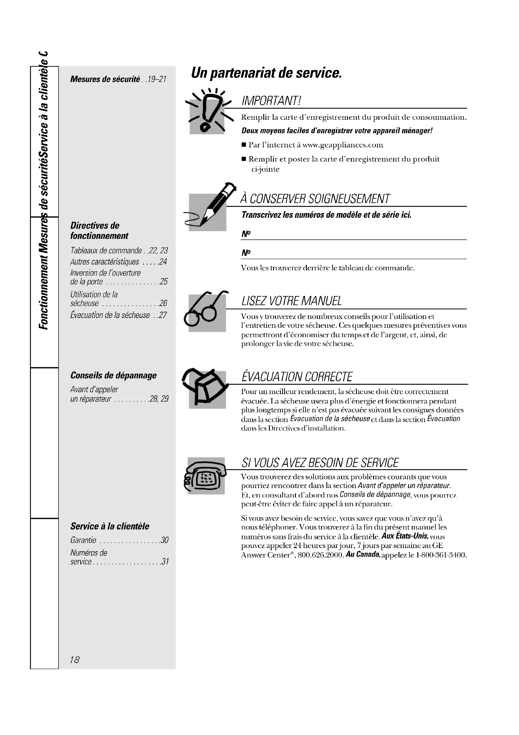 Vous trouverez des solutions aux problèmes courants que vouspourriez rencontrer dans la section Avant d’appeler un réparateur Et, en consultant d’abord nos Conseils de dépannage, vous pourrezpeut-être éviter de faire appel à un réparateur.Si vous avez besoin de service, vous savez que vous n’avez qu’à nous téléphoner. Vous trouverez à la fin du présent manuel lesnuméros sans frais du service à la clientèle. Aux États-Unis, vous pouvez appeler 24 heures par jour, 7 jours par semaine au GEAnswer Center®, 800.626.2000. Au Canada,appelez le 1-800-361-3400. IMPORTANT! Remplir la carte d’enregistrement du produit de consommation.Deux moyens faciles d’enregistrer votre appareil ménager!■ Par l’internet à www.geappliances.com■ Remplir et poster la carte d’enregistrement du produit ci-jointe ÉVACUATION CORRECTE Pour un meilleur rendement, la sécheuse doit être correctementévacuée. La sécheuse usera plus d’énergie et fonctionnera pendantplus longtemps si elle n’est pas évacuée suivant les consignes donnéesdans la section Évacuation de la sécheuseet dans la section Évacuationdans les Directives d’installation. 18Service à la clientèleConseils de dépannageFonctionnementMesures de sécurité