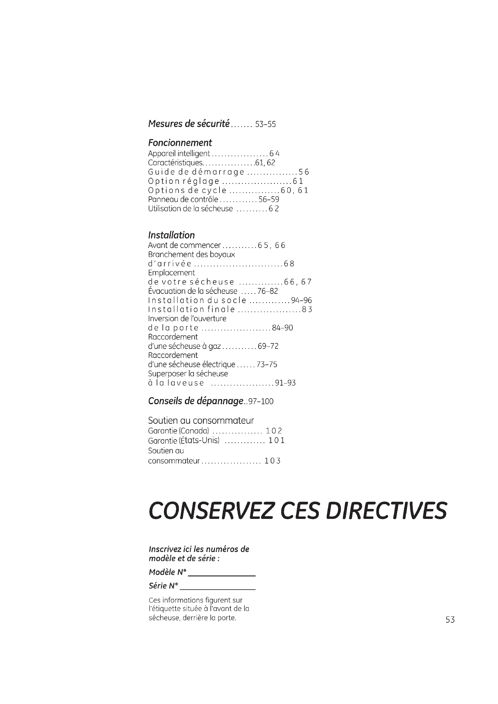 - Soutien au consommateur Inscrivez ici les numéros de modèle et de série : Modèle N° ________________ Série N° __________________ Ces informations figurent sur l’étiquette située à l’avant de la sécheuse, derrière la porte. CONSERVEZ CES DIRECTIVES Mettez l’appareil à la terre conformément à tous les codes et règlements en vigueur. Suivez les Directives d’installation. Installez ou entreposez l’appareil dans une pièce où la température est supérieure à 0°C, et où il sera à l’abri des intempéries. Branchez l’appareil sur un circuit protégé et de capacité appropriée afin d’éviter toute surcharge électrique. Retirez tous les articles d’emballage tranchants et jetez tous les matériaux de transport. Conduit d’évacuation: p. 103
