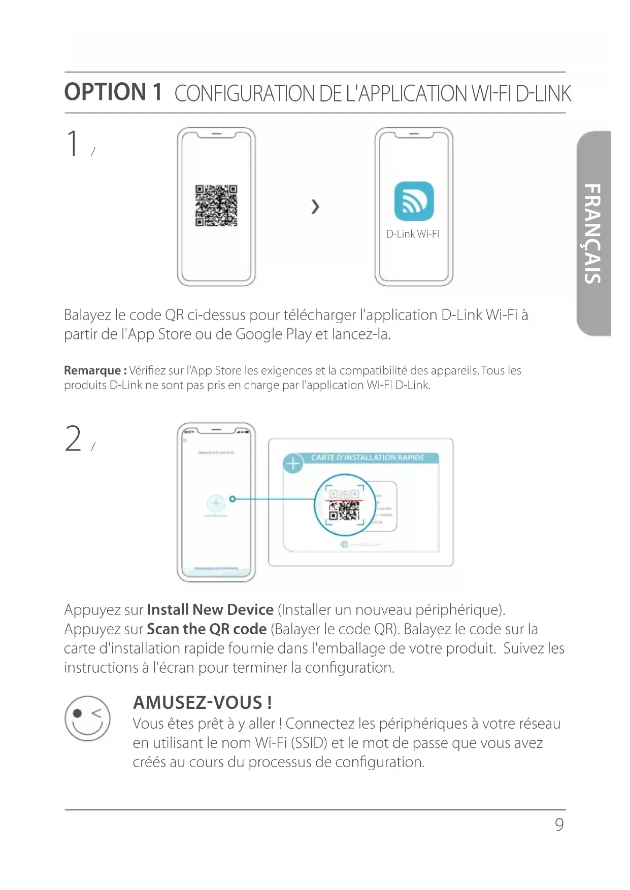 www.dlink.com Nom du modèle: PÉRIPHÉRIQUE Nom Wi-Fi: d-link-XXXX Mot de passe: XXXXXXXX N/S: 123456789 AMUSEZ-VOUS! Vous êtes prêt à y aller ! Connectez les périphériques à votre réseau en utilisant le nom Wi-Fi (SSID) et le mot de passe que vous avez créés au cours du processus de configuration. D-Link Wi-FI10 FRANÇAIS