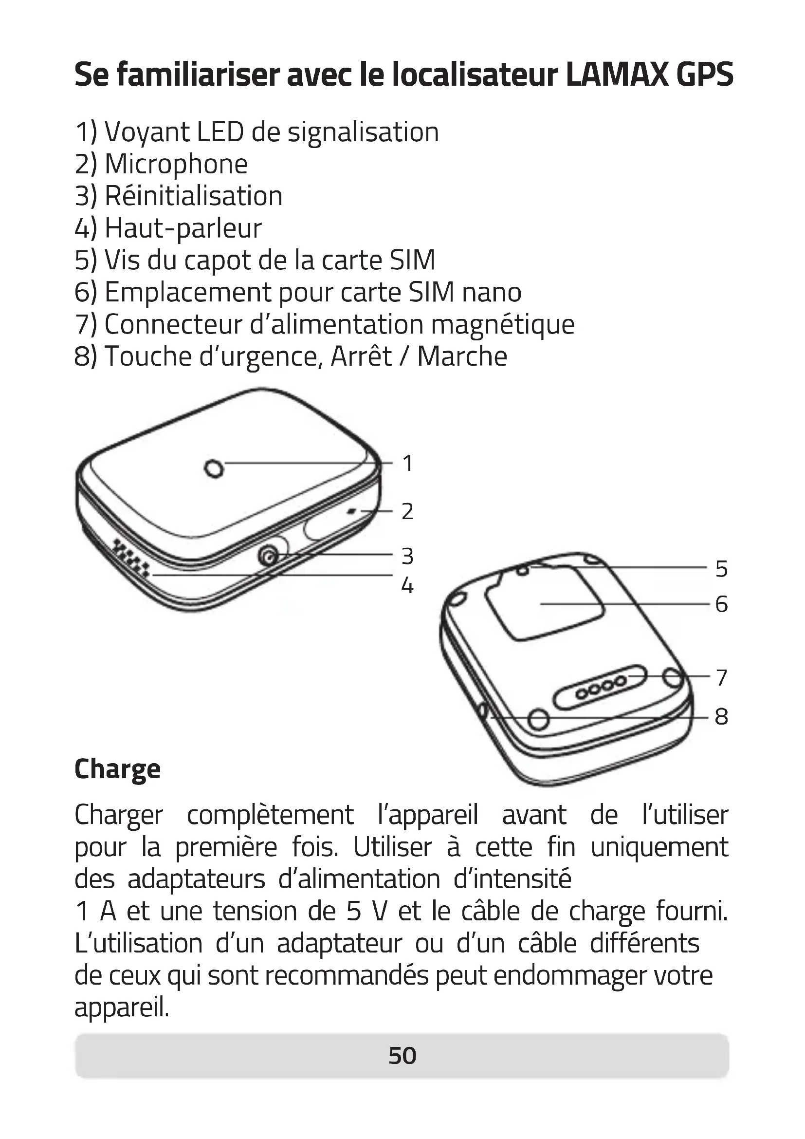 FR50 Charge Charger complètement l’appareil avant de l’utiliser pour la première fois. Utiliser à cette fin uniquement des adaptateurs d’alimentation d’intensité 1 A et une tension de 5 V et le câble de charge fourni. L’utilisation d’un adaptateur ou d’un câble différents de ceux qui sont recommandés peut endommager votre appareil. Se familiariser avec le localisateur LAMAX GPS