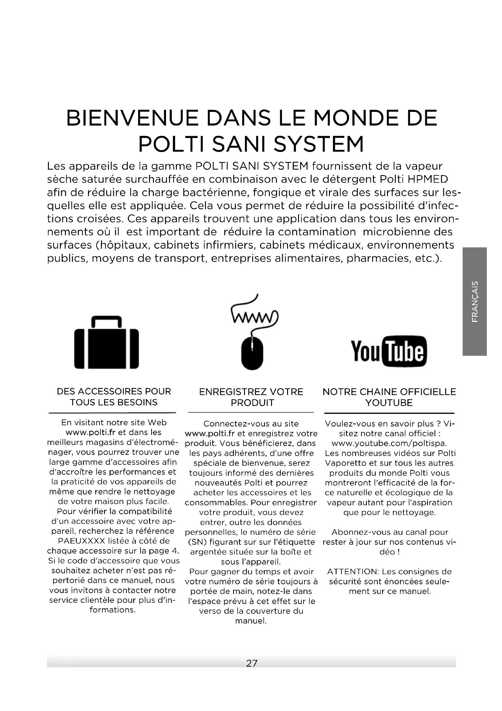YOUTUBE Voulez-vous en savoir plus? Vi-sitez notre canal officiel:www.youtube.com/poltispa.Les nombreuses vidéos sur PoltiVaporetto et sur tous les autresproduits du monde Polti vousmontreront l’efficacité de la for-ce naturelle et écologique de lavapeur autant pour l’aspirationque pour le nettoyage. Abonnez-vous au canal pourrester à jour sur nos contenus vi-déo!ATTENTION: Les consignes desécurité sont énoncées seule-ment sur ce manuel.28 AVERTISSEMENTS EN MATIÈRE DE SÉCURITÉ