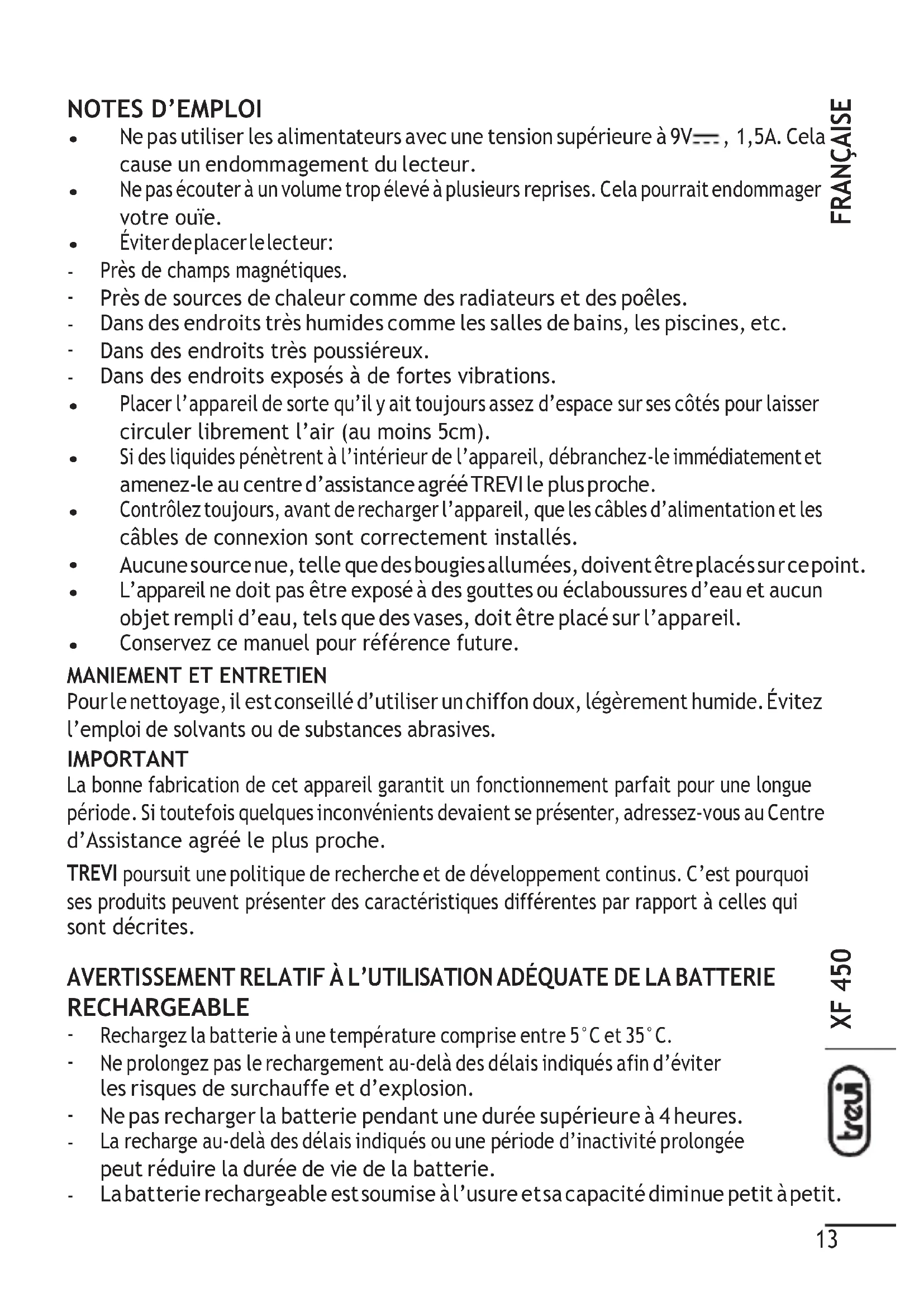 Retrouvez gratuitement la notice de l'appareil XF 450 Trevi au format PDF.