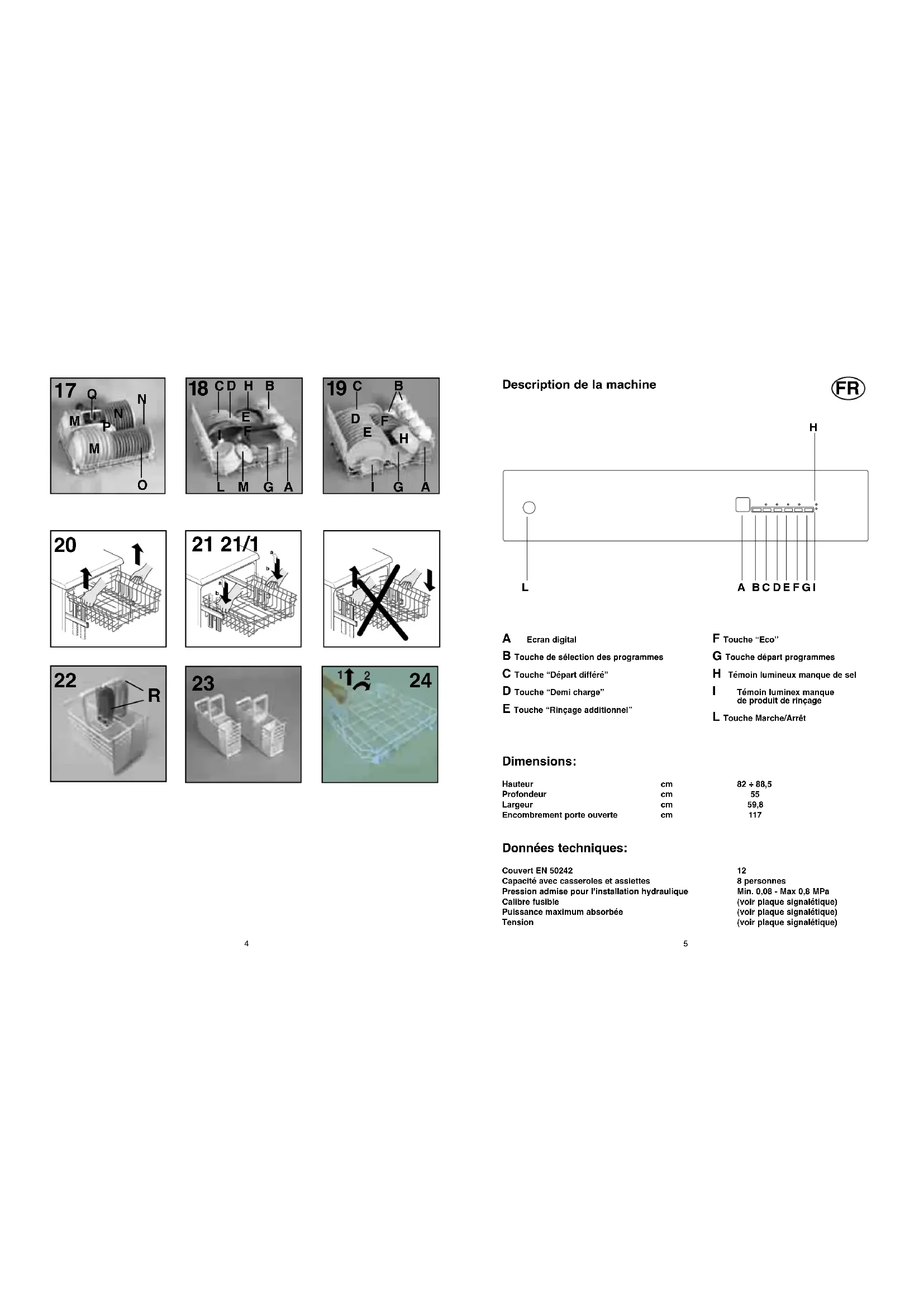 position verticale. Lavage 1/2 charge panier supérieur 1/2 charge mixte (fig. 18) A =verres B = tasses C = assiettes creuses D = assiettes plates E =assiettes à dessert F =soucoupes G =casserole H =couvercle I = poéle L =coupe moyenne M = petite coupe 1/2 charge standard (fig. 19) A = 6 verres B = 5 + 1 tasses C = plat D =6 assiettes creuses E =6 assiettes plates F =6 assiettes à dessert G =6 soucoupes H =coupe moyenne I = petite coupe Les couverts doivent être placés dans le panier à couverts prévu a cet effet. Il devra être remis dans son emplacement d'origine, soit dans le panier inférieur, en cycle de lava- ge normal.16 Information pour les essais en laboratoire. Programme comparatif général (voir liste des programmes de lavage) Selon norme EN 50242: