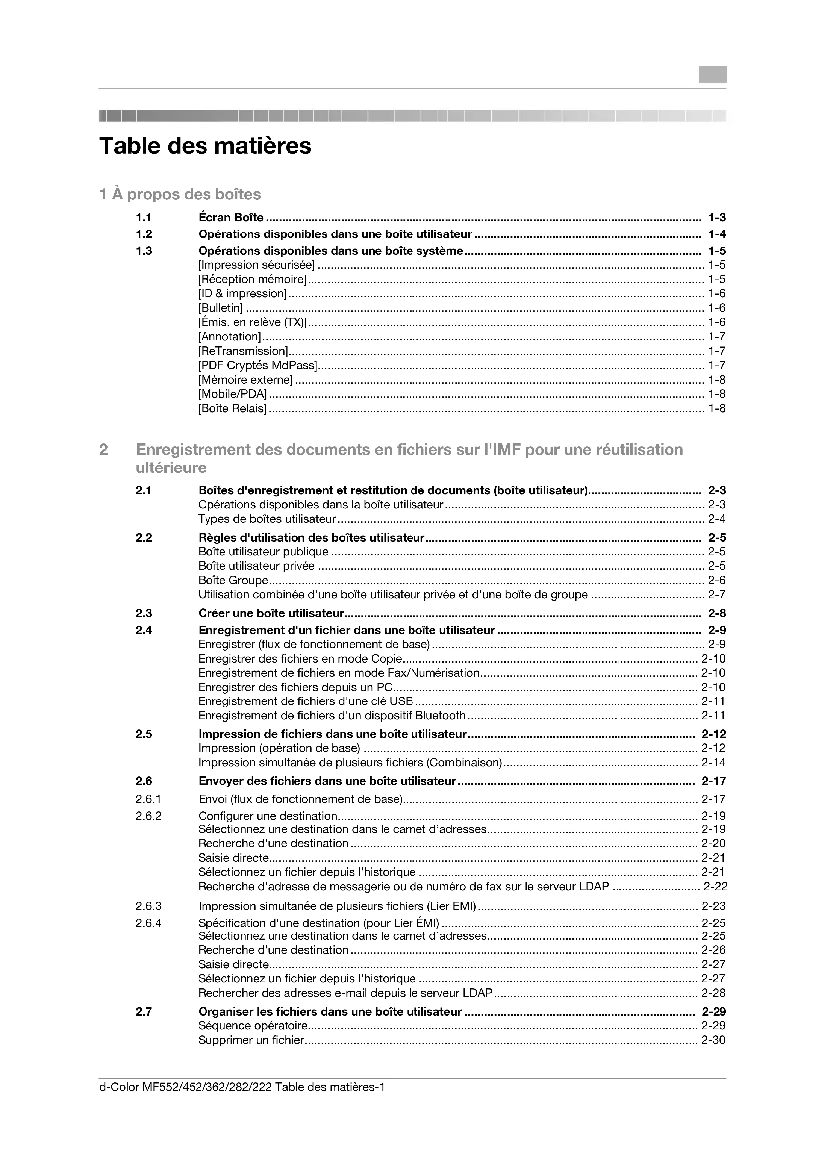 - remplacement de composants ou d’accessoires originaux par des pièces non approuvées par le constructeur, ou effectué par du personnel non autorisé. Tous droits réservés. Aucune partie de ce document ne peut être reproduite ou transmise sous quelque forme ou par quelque moyen que ce soit, électronique ou mécanique, tel que par photocopie, enregistrement ou par un système quelconque de stockage et de rappel des informations, sans l’autorisation écrite de l’éditeur. Les qualités requises pour ce produit sont garanties par le label appliqué sur le produit même. Tous droits réservésImportant ! En raison des modifications apportées à la spécification de l'interface utilisateur, les images de l'interface utilisateur illustrées dans les guides de l'utilisateur peuvent différer légèrement des descriptions qui en sont faites. Les boutons "Annul", "OK", "Ferm.", "Oui" et "Non" ont été remplacés par des icônes et le texte de leur description peut encore contenir les mots "Annul", "OK", "Ferm.", "Oui" et "Non". Précédente conception : Nouvelle conception :d-Color MF552/452/362/282/222 Table des matières-1 Table des matières 1 À propos des boîtes 1.1 Écran Boîte ...................................................................................................................................... 1-3 1.2 Opérations disponibles dans une boîte utilisateur ...................................................................... 1-4 1.3 Opérations disponibles dans une boîte système......................................................................... 1-5 [Impression sécurisée] ....................................................................................................................... 1-5 [Réception mémoire].......................................................................................................................... 1-5 [ID & impression]................................................................................................................................ 1-6 [Bulletin] ............................................................................................................................................. 1-6 [Émis. en relève (TX)].......................................................................................................................... 1-6 [Annotation]........................................................................................................................................ 1-7 [ReTransmission]................................................................................................................................ 1-7 [PDF Cryptés MdPass]....................................................................................................................... 1-7 [Mémoire externe] .............................................................................................................................. 1-8 [Mobile/PDA]...................................................................................................................................... 1-8 [Boîte Relais] ...................................................................................................................................... 1-8 2 Enregistrement des documents en fichiers sur l'IMF pour une réutilisation ultérieure