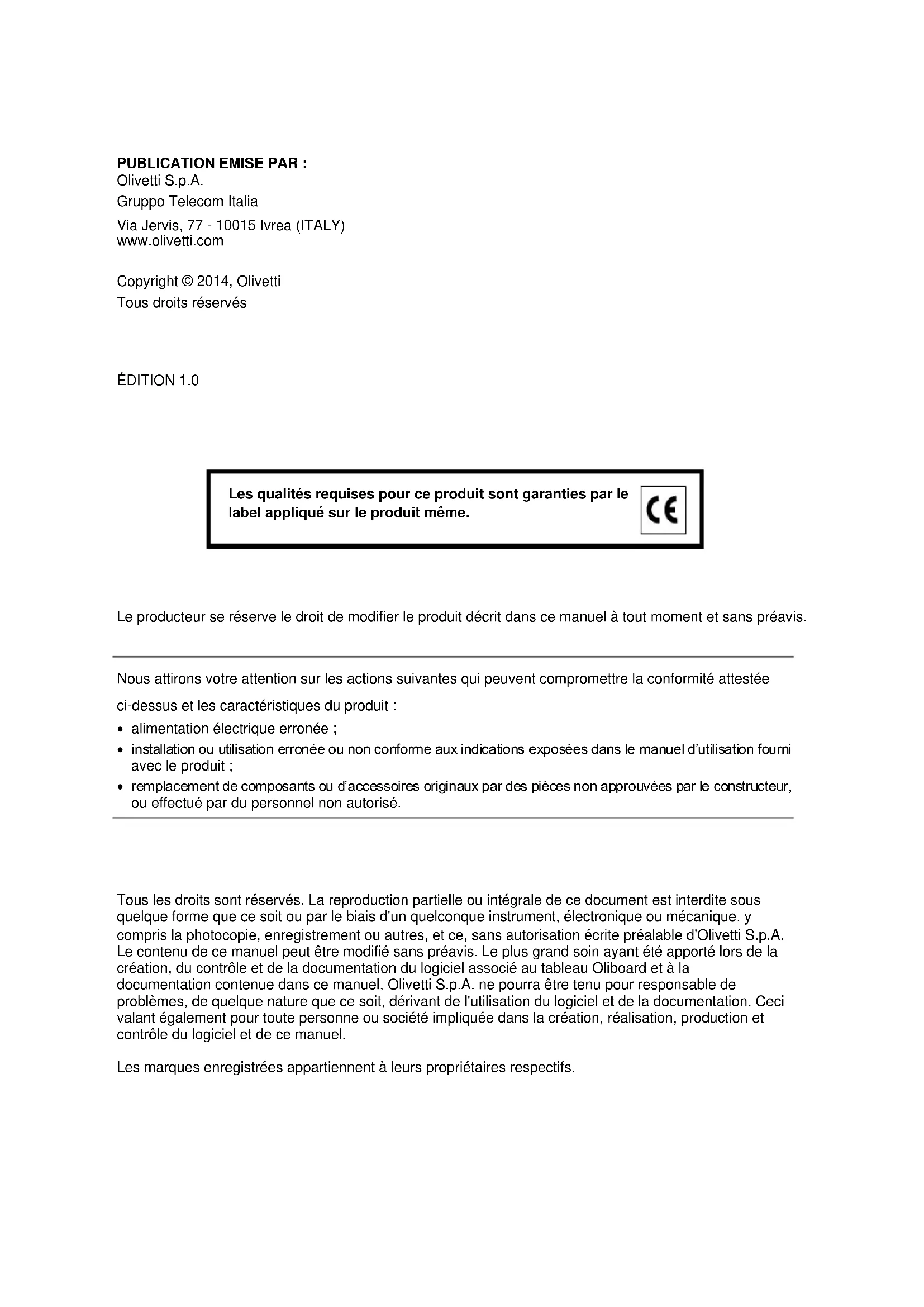Tous les droits sont réservés. La reproduction partielle ou intégrale de ce document est interdite sous quelque forme que ce soit ou par le biais d'un quelconque instrument, électronique ou mécanique, y compris la photocopie, enregistrement ou autres, et ce, sans autorisation écrite préalable d'Olivetti S.p.A. Le contenu de ce manuel peut être modifié sans préavis. Le plus grand soin ayant été apporté lors de la création, du contrôle et de la documentation du logiciel associé au tableau Oliboard et à la documentation contenue dans ce manuel, Olivetti S.p.A. ne pourra être tenu pour responsable de problèmes, de quelque nature que ce soit, dérivant de l'utilisation du logiciel et de la documentation. Ceci valant également pour toute personne ou société impliquée dans la création, réalisation, production et contrôle du logiciel et de ce manuel. Les marques enregistrées appartiennent à leurs propriétaires respectifs.