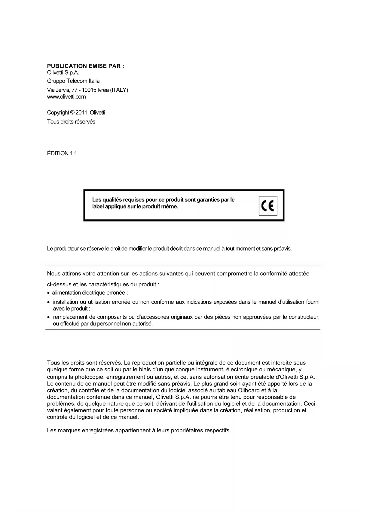 Tous les droits sont réservés. La reproduction partielle ou intégrale de ce document est interdite sous quelque forme que ce soit ou par le biais d'un quelconque instrument, électronique ou mécanique, y compris la photocopie, enregistrement ou autres, et ce, sans autorisation écrite préalable d'Olivetti S.p.A. Le contenu de ce manuel peut être modifié sans préavis. Le plus grand soin ayant été apporté lors de la création, du contrôle et de la documentation du logiciel associé au tableau Oliboard et à la documentation contenue dans ce manuel, Olivetti S.p.A. ne pourra être tenu pour responsable de problèmes, de quelque nature que ce soit, dérivant de l'utilisation du logiciel et de la documentation. Ceci valant également pour toute personne ou société impliquée dans la création, réalisation, production et contrôle du logiciel et de ce manuel. Les marques enregistrées appartiennent à leurs propriétaires respectifs.