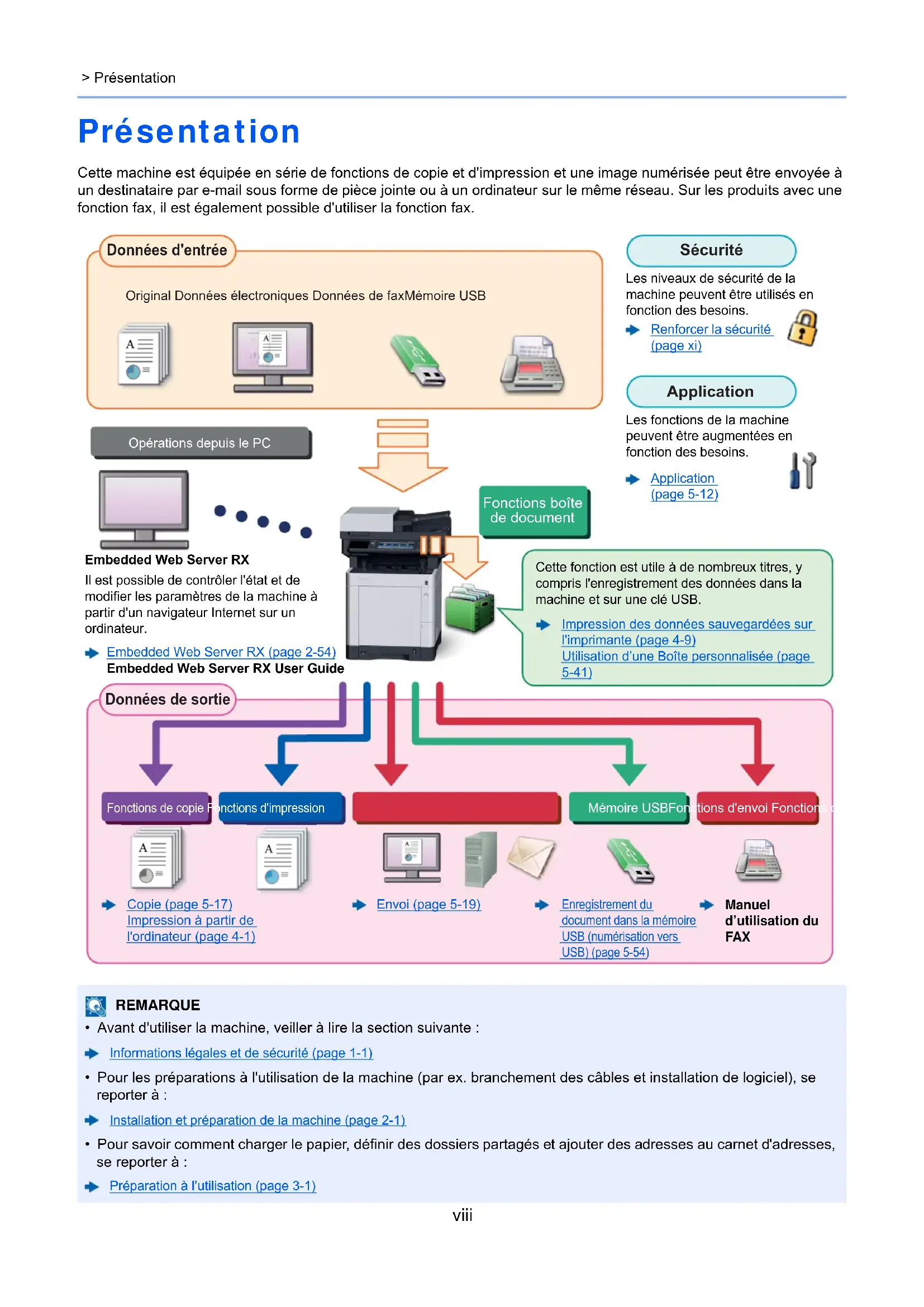 - Pour savoir comment charger le papier, définir des dossiers partagés et ajouter des adresses au carnet d'adresses, se reporter à : Préparation à l’utilisation (page 3-1) Original Données électroniques Données de faxMémoire USB Données d'entrée Opérations depuis le PC Fonctions boîte de document Application Sécurité Données de sortie Fonctions de copie Fonctions d'impressionMémoire USBFonctions d'envoi Fonctions de fax Manuel d’utilisation du FAX Cette fonction est utile à de nombreux titres, y compris l'enregistrement des données dans la machine et sur une clé USB.Impression des données sauvegardées sur l'imprimante (page 4-9)Utilisation d’une Boîte personnalisée (page 5-41)Les fonctions de la machine peuvent être augmentées en fonction des besoins.Application (page 5-12)Les niveaux de sécurité de la machine peuvent être utilisés en fonction des besoins.Envoi (page 5-19) Embedded Web Server RX Il est possible de contrôler l'état et de modifier les paramètres de la machine à partir d'un navigateur Internet sur un ordinateur. Embedded Web Server RX (page 2-54) Embedded Web Server RX User Guide Renforcer la sécurité (page xi)Copie (page 5-17)Impression à partir de l'ordinateur (page 4-1)Enregistrement du document dans la mémoire USB (numérisation vers USB) (page 5-54)ix > Caractéristiques de la machine Caractéristiques de la machine La machine est dotée de nombreuses fonctions utiles. Utilisation de différentes fonctions (page 6-1) Voici quelques exemples. Optimiser le flux de travail au bureau Accéder aux fonctions courantes d'un simple geste (Favoris) Il est possible de prédéfinir des fonctions courantes. Lorsque des paramètres fréquemment utilisés sont enregistrés dans les favoris, il est possible de les rappeler facilement. L'utilisation de ce favori apporte les mêmes résultats, même s'il est utilisé par une autre personne. Favoris (page 5-7) Configurer facilement la machine (Assistant d'installation rapide) Il est possible de configurer les paramètres nécessaire avant d'utiliser la machine grâce au mode assistant. Assistant d'installation rapide (page 2-36) Configurer facilement le fax (configuration du fax) Il est possible de configurer les paramètres nécessaire avant d'utiliser le fax grâce au mode assistant. Configuration du FAX (page 2-36) Optimiser le flux de travail au bureau Numériser des originaux de formats différents en une seule fois (Originaux mixtes) Utile lors de la préparation des matériels de conférence. Il est possible de définir des originaux de formats différents en une seule fois afin de ne pas avoir à réinitialiser les originaux quel que soit leur format. Format d’originaux différents (page 6- 15) Numériser un grand nombre d'originaux en lots séparés et produire un seul travail (Numérisation continue) Utile lors de la préparation de documents contenant de nombreuses pages. S’il n’est pas possible de placer un grand nombre d’originaux dans le chargeur de documents à la fois, il est possible de numériser les originaux dans des lots séparés puis de les copier ou envoyer dans un travail unique. Numérisation continue (page 6-28) Effectuer un seul envoi avec plusieurs options d'envoi (Envoi multiple) Il est possible d'envoyer un même document à plusieurs destinataires en utilisant une méthode différente. Il est possible de spécifier plusieurs destinataires aux méthodes d'envoi différentes comme E-mail, SMB et fax. Le flux de travail est ainsi réduit en envoyant le travail en une seule fois. Envoi vers différents types de destinataires (Envoi multiple) (page 5-30)