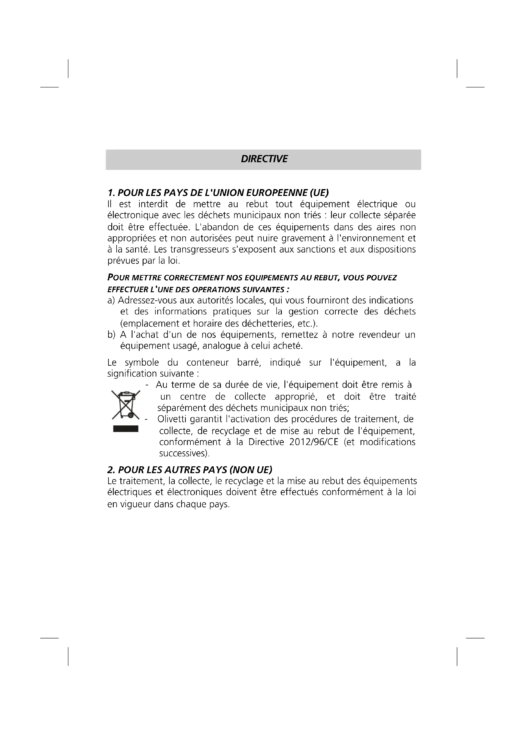 Il est interdit de mettre au rebut tout équipement électrique ou électronique avec les déchets municipaux non triés : leur collecte séparée doit être effectuée. L'abandon de ces équipements dans des aires non appropriées et non autorisées peut nuire gravement à l'environnement et à la santé. Les transgresseurs s'exposent aux sanctions et aux dispositions prévues par la loi. POUR METTRE CORRECTEMENT NOS EQUIPEMENTS AU REBUT, VOUS POUVEZ EFFECTUER L 'UNE DES OPERATIONS SUIVANTES : a) Adressez-vous aux autorités locales, qui vous fourniront des indications et des informations pratiques sur la gestion correcte des déchets (emplacement et horaire des déchetteries, etc.). b) A l'achat d'un de nos équipements, remettez à notre revendeur un équipement usagé, analogue à celui acheté. Le symbole du conteneur barré, indiqué sur l'équipement, a la signification suivante : - Au terme de sa durée de vie, l'équipement doit être remis à un centre de collecte approprié, et doit être traité séparément des déchets municipaux non triés; - Olivetti garantit l'activation des procédures de traitement, de collecte, de recyclage et de mise au rebut de l'équipement, conformément à la Directive 2012/96/CE (et modifications successives).