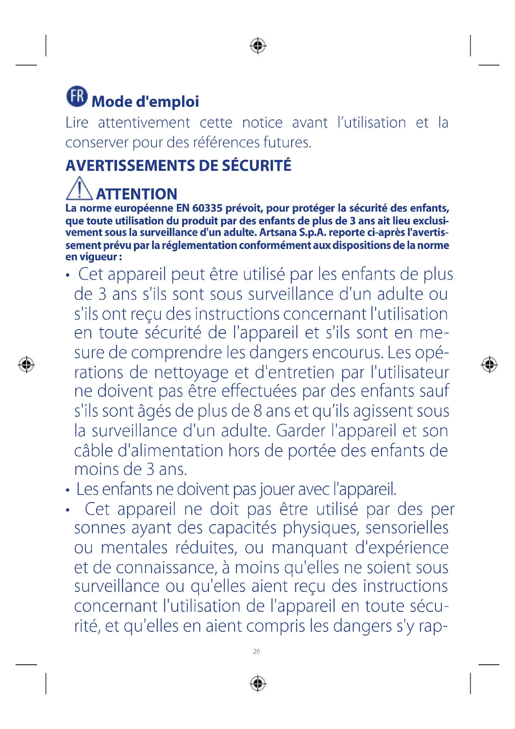 ATTENTION La norme européenne EN 60335 prévoit, pour protéger la sécurité des enfants, que toute utilisation du produit par des enfants de plus de 3 ans ait lieu exclusi