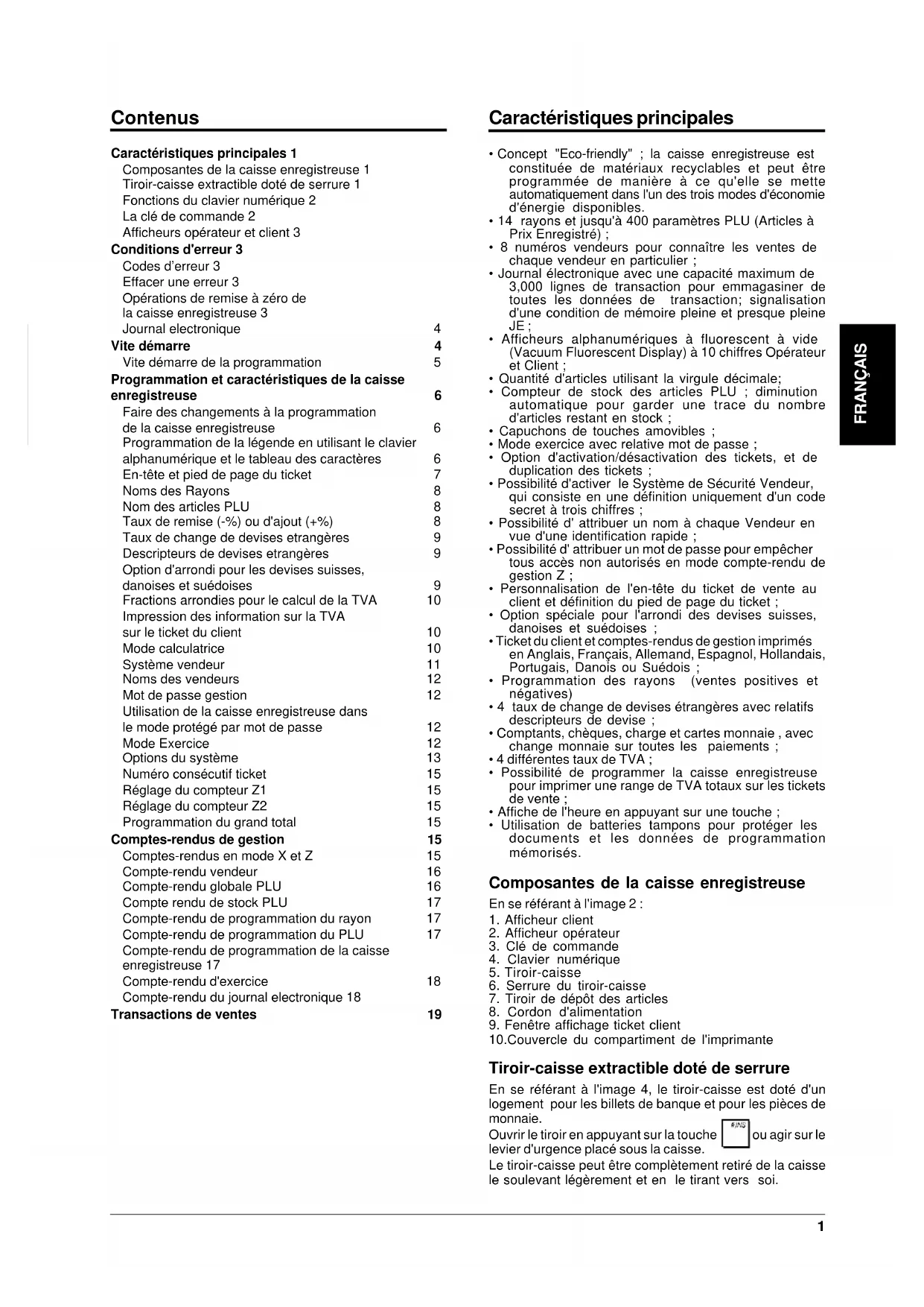 10.Couvercle du compartiment de l'imprimante Tiroir-caisse extractible doté de serrure En se référant à l'image 4, le tiroir-caisse est doté d'un logement pour les billets de banque et pour les pièces de monnaie. Ouvrir le tiroir en appuyant sur la touche ou agir sur le levier d'urgence placé sous la caisse. Le tiroir-caisse peut être complètement retiré de la caisse le soulevant légèrement et en le tirant vers soi. Caractéristiques principales 1 Composantes de la caisse enregistreuse 1 Tiroir-caisse extractible doté de serrure 1 Fonctions du clavier numérique 2 La clé de commande 2 Afficheurs opérateur et client 3 Conditions d'erreur 3 Codes d’erreur 3 Effacer une erreur 3 Opérations de remise à zéro de la caisse enregistreuse 3 Journal electronique 4 Vite démarre 4 Vite démarre de la programmation 5 Programmation et caractéristiques de la caisse enregistreuse 6 Faire des changements à la programmation de la caisse enregistreuse 6 Programmation de la légende en utilisant le clavier alphanumérique et le tableau des caractères 6 En-tête et pied de page du ticket 7 Noms des Rayons 8 Nom des articles PLU 8 Taux de remise (-%) ou d'ajout (+%) 8 Taux de change de devises etrangères 9 Descripteurs de devises etrangères 9 Option d'arrondi pour les devises suisses, danoises et suédoises 9 Fractions arrondies pour le calcul de la TVA 10 Impression des information sur la TVA sur le ticket du client 10 Mode calculatrice 10 Système vendeur 11 Noms des vendeurs 12 Mot de passe gestion 12 Utilisation de la caisse enregistreuse dans le mode protégé par mot de passe 12 Mode Exercice 12 Options du système 13 Numéro consécutif ticket 15 Réglage du compteur Z1 15 Réglage du compteur Z2 15 Programmation du grand total 15 Comptes-rendus de gestion 15 Comptes-rendus en mode X et Z 15 Compte-rendu vendeur 16 Compte-rendu globale PLU 16 Compte rendu de stock PLU 17 Compte-rendu de programmation du rayon 17 Compte-rendu de programmation du PLU 17 Compte-rendu de programmation de la caisse enregistreuse 17 Compte-rendu d'exercice 18 Compte-rendu du journal electronique 18 Transactions de ventes 192 Fonctions du clavier numérique En se référant à l'image 5 :