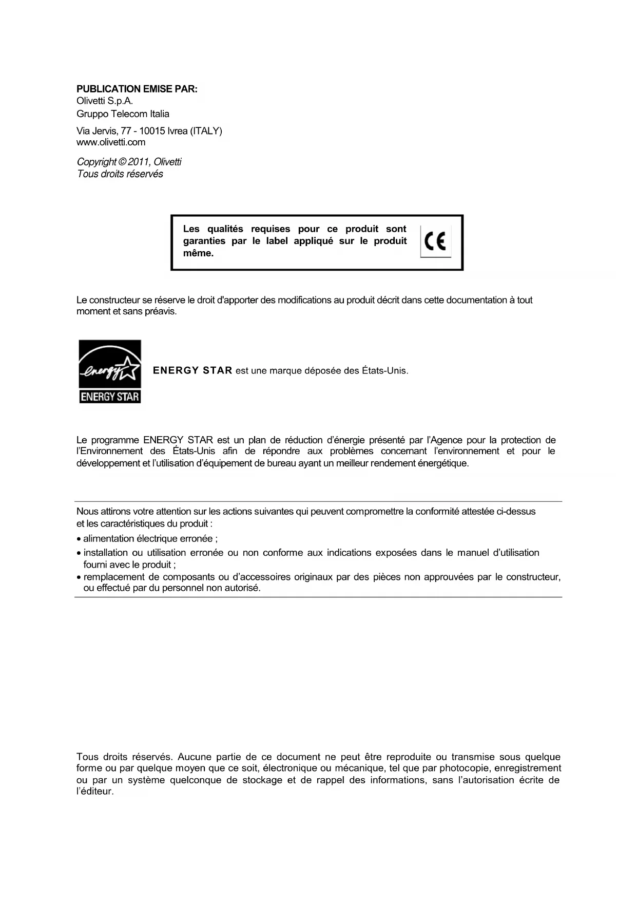 Le programme ENERGY STAR est un plan de réduction d’énergie présenté par l’Agence pour la protection de l’Environnement des États-Unis afin de répondre aux problèmes concernant l’environnement et pour le développement et l’utilisation d’équipement de bureau ayant un meilleur rendement énergétique. Nous attirons votre attention sur les actions suivantes qui peuvent compromettre la conformité attestée ci-dessus et les caractéristiques du produit :