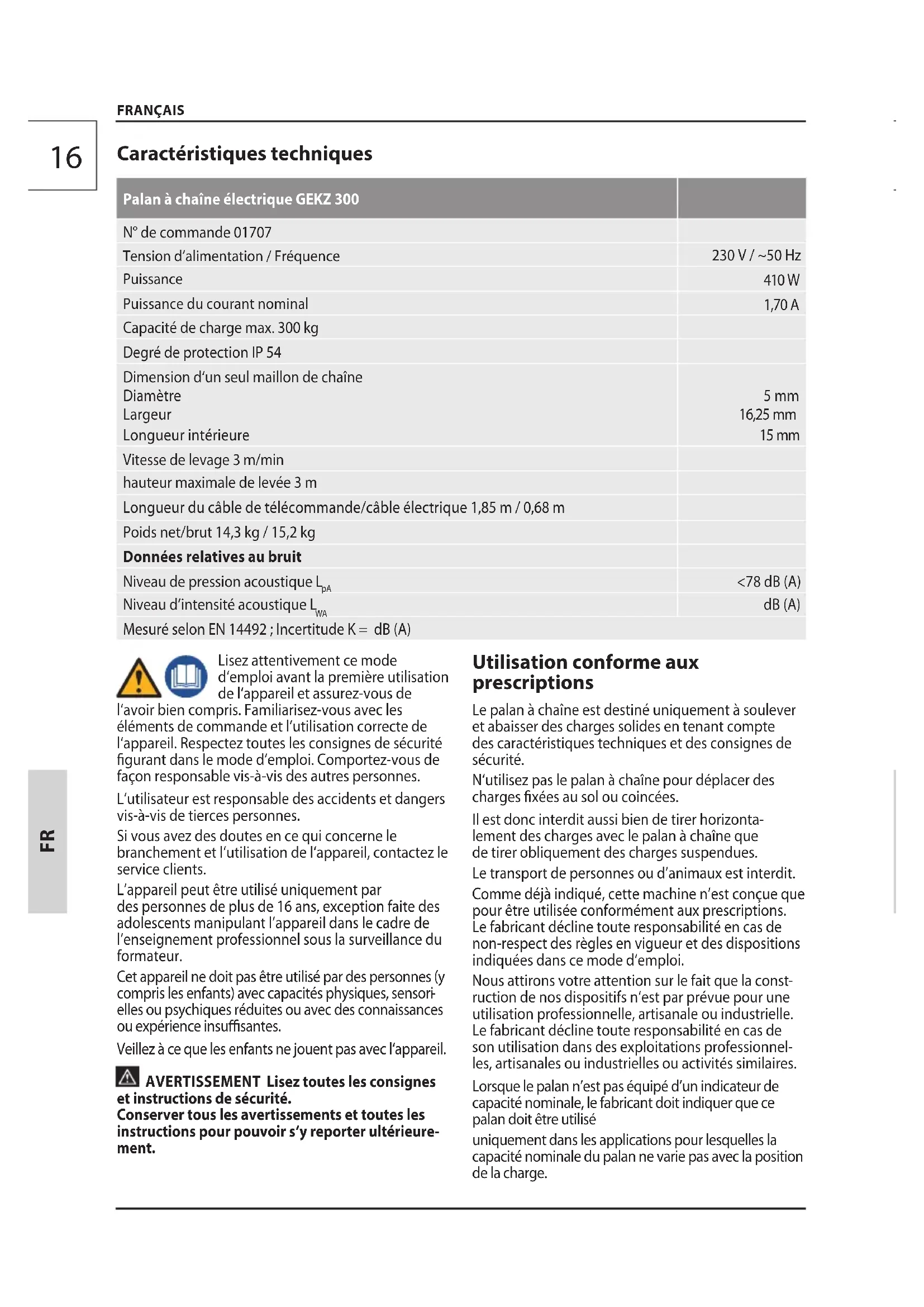 ruction de nos dispositifs n‘est par prévue pour une utilisation professionnelle, artisanale ou industrielle. Le fabricant décline toute responsabilité en cas de son utilisation dans des exploitations professionnel- les, artisanales ou industrielles ou activités similaires. Lorsque le palan n’est pas équipé d’un indicateur de capacité nominale, le fabricant doit indiquer que ce palan doit être utilisé uniquement dans les applications pour lesquelles la capacité nominale du palan ne varie pas avec la position de la charge. Caractéristiques techniques Palan à chaîne électrique GEKZ 300 N° de commande 01707 Tension d’alimentation / Fréquence 230 V / ~50 Hz Puissance 410 W Puissance du courant nominal 1,70 A Capacité de charge max. 300 kg Degré de protection IP 54 Dimension d‘un seul maillon de chaîne Diamètre Largeur Longueur intérieure 5 mm 16,25 mm 15 mm Vitesse de levage 3 m/min hauteur maximale de levée 3 m Longueur du câble de télécommande/câble électrique 1,85 m / 0,68 m Poids net/brut 14,3 kg / 15,2 kg Données relatives au bruit Niveau de pression acoustique L