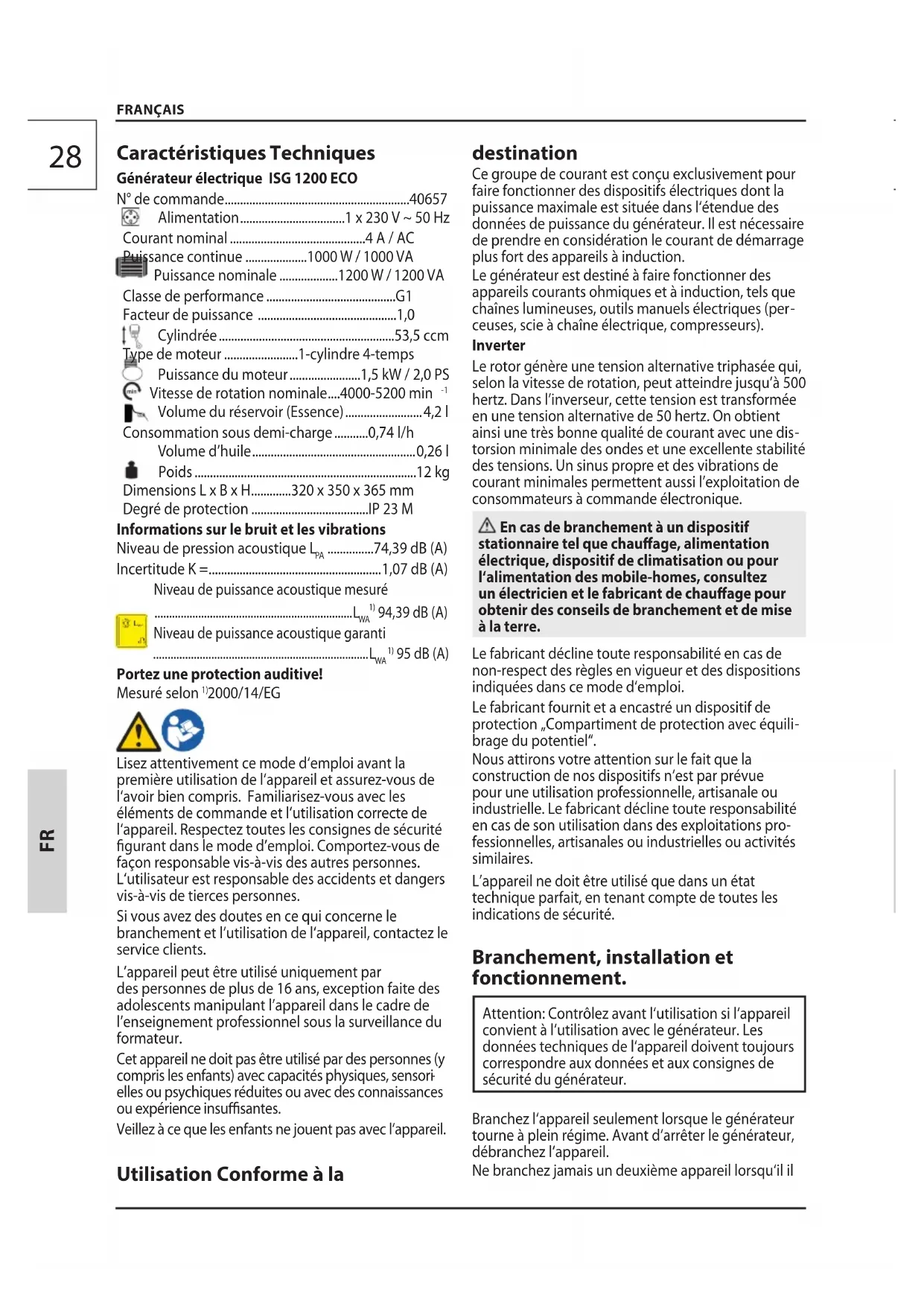 fessionnelles, artisanales ou industrielles ou activités similaires. L’appareil ne doit être utilisé que dans un état technique parfait, en tenant compte de toutes les indications de sécurité. Branchement, installation et fonctionnement. Attention: Contrôlez avant l‘utilisation si l‘appareil convient à l‘utilisation avec le générateur. Les données techniques de l‘appareil doivent toujours correspondre aux données et aux consignes de sécurité du générateur. Branchez l‘appareil seulement lorsque le générateur tourne à plein régime. Avant d‘arrêter le générateur, débranchez l‘appareil. Ne branchez jamais un deuxième appareil lorsqu‘il il Caractéristiques Techniques Générateur électrique ISG 1200 ECO N° de commande ............................................................40657